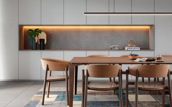 O padrão Quartzo Bienna, da Linha Velluto, surpreende por suas cores, veios e desenhos. Cada detalhe confere naturalidade e personalidade a projetos autênticos.