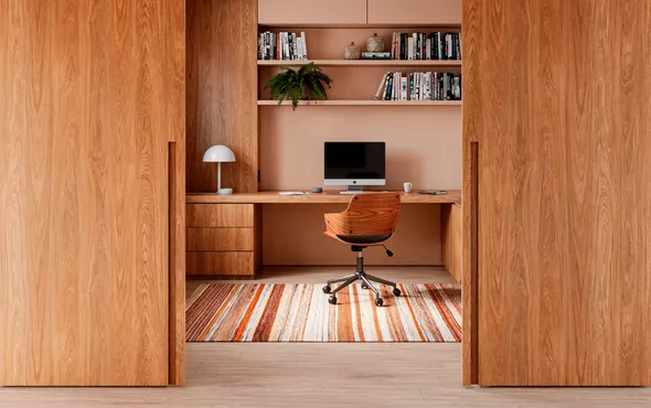 Da Linha Design, o padrão Nogueira Flórida é inspirado nos desenhos de catedrais, retratando um aspecto mais rústico aliado à tonalidade de madeira moderna. Como resultado, os ambientes apresentam um ar mais tranquilo e convidativo.