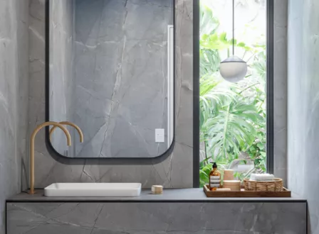 Material natural a partir do carbono, de tonalidade profunda e neutra. Mineral cinza escuro que traz versatilidade para as combinações.
