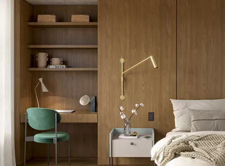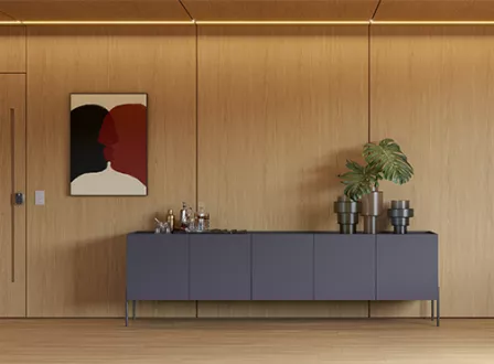 Inspirado no design característico dos móveis do norte da Itália, essa madeira de tonalidade escura e quente e seus movimentos calmos e naturais trazem elegância ao espaço.
