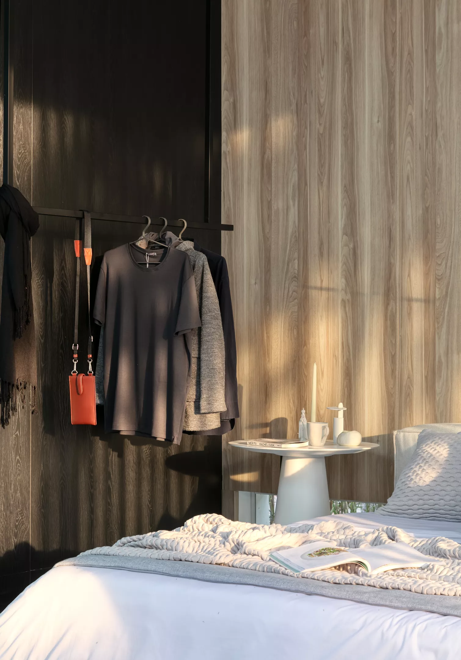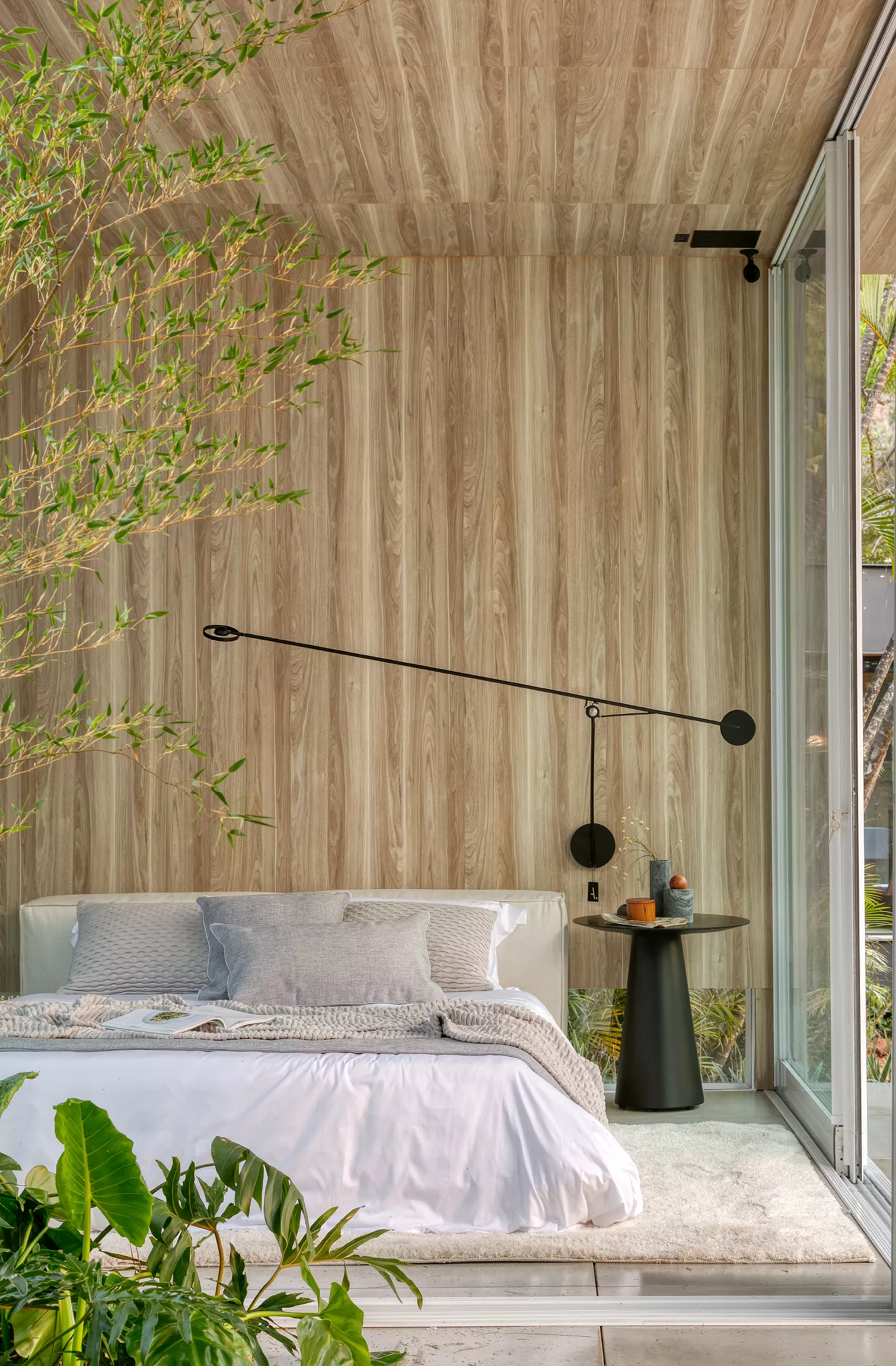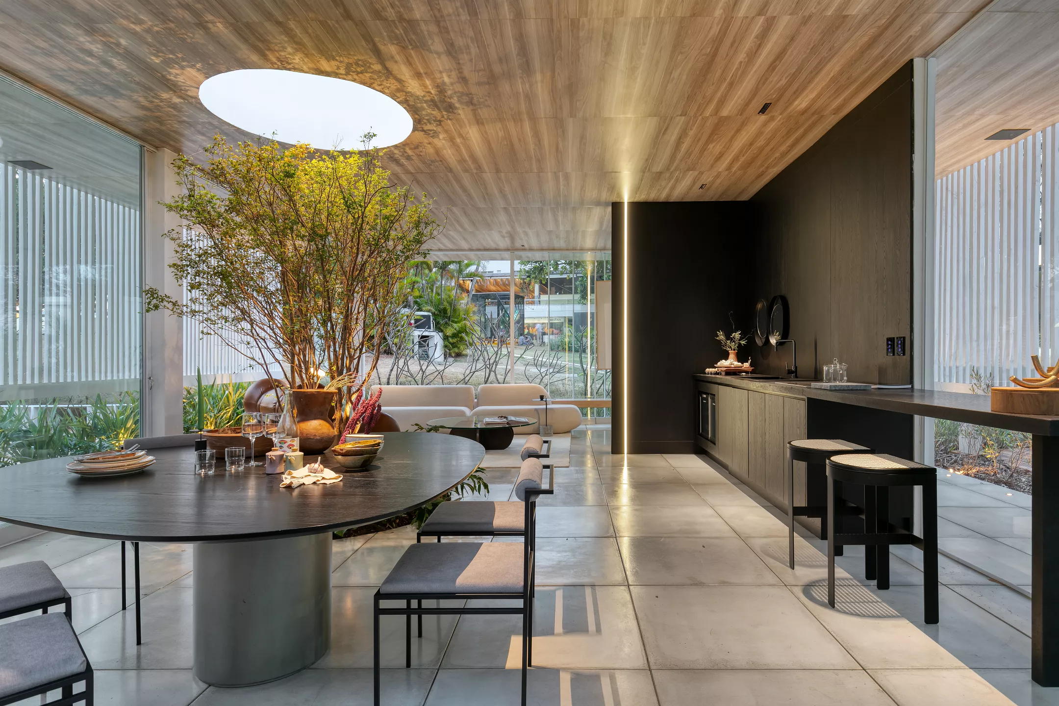 Assinado por Júnior Piacesi, o projeto parte do conceito de uma casa modo-lar, pensada assim mesmo. Toda em estrutura metálica, de montagem rápida, encapada por breezes, utilizando placas de cimento no piso e rasgos de luz no teto, demonstra simplicidade tanto na montagem, quanto na arquitetura e uso do espaço. Em uma área de 320 m², a opção pelo revestimento em madeira, da Duratex, traz conforto visual e acolhimento. O arquiteto especificou os padrões Noce Califórnia, da linha Essencial e o Absoluto, lançamento da linha Design para revestir o teto e paredes. Os ambientes integrados sugerem que morar, receber família e amigos e mesmo trabalhar em um mesmo espaço é uma realidade e são ações que podem estar em perfeita harmonia.