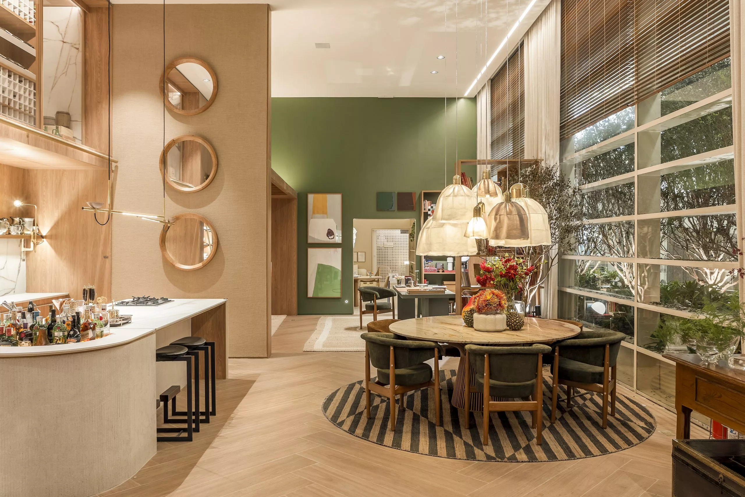 Batizado de Casa Essência Duratex por trazer em si o que há de mais puro na marca com seus painéis de madeira, o espaço possui 270m² e é composto por living, cozinha, adega, quarto com banheiro e closet, home office, sala de jantar e varanda, onde o destaque vai para o paisagismo exuberante com jabuticabeiras de mais de 3m de altura, feito especialmente pelo premiado paisagista Alex Hanazaki para compor a estética do espaço e ressaltar a integração com a natureza.