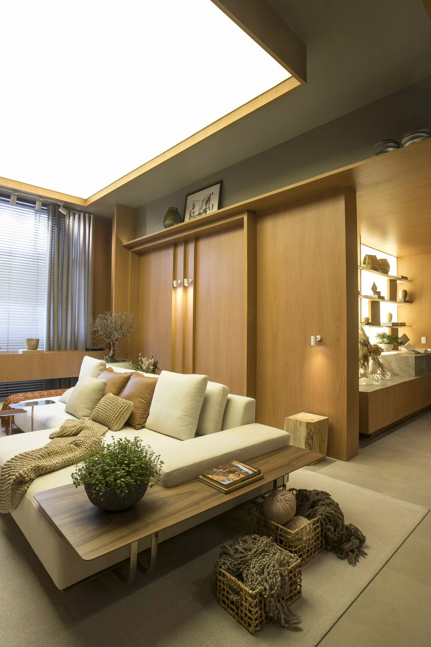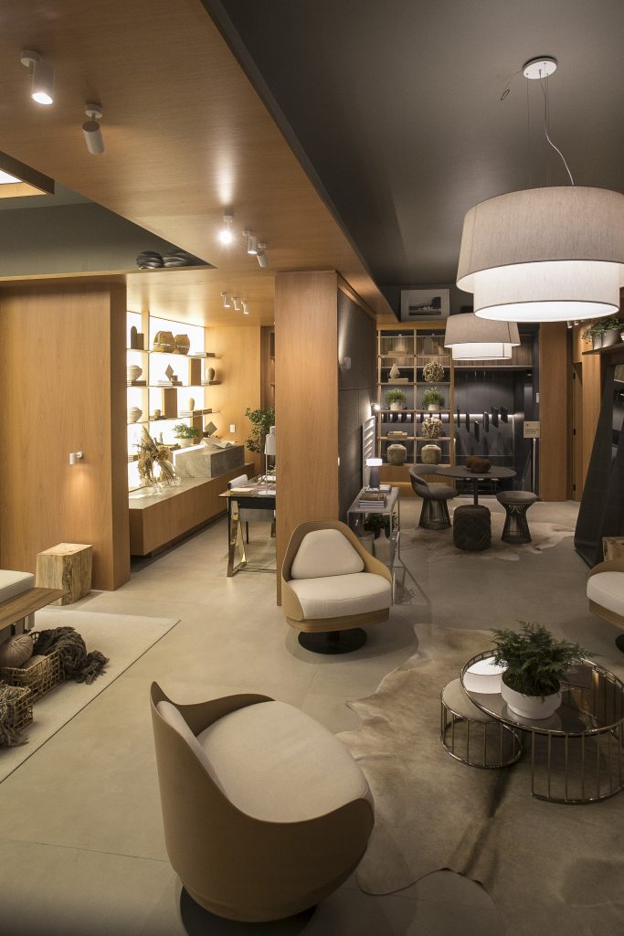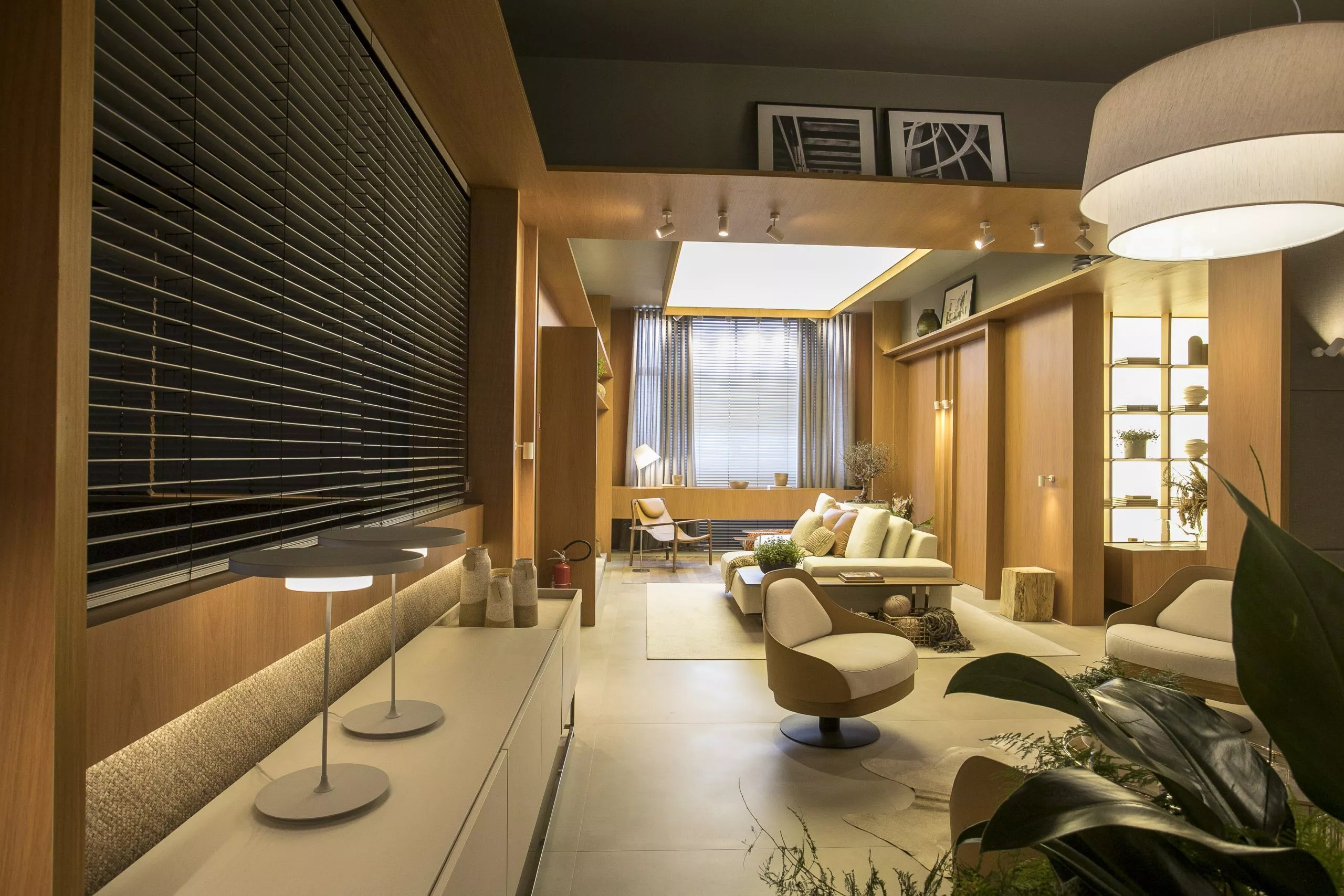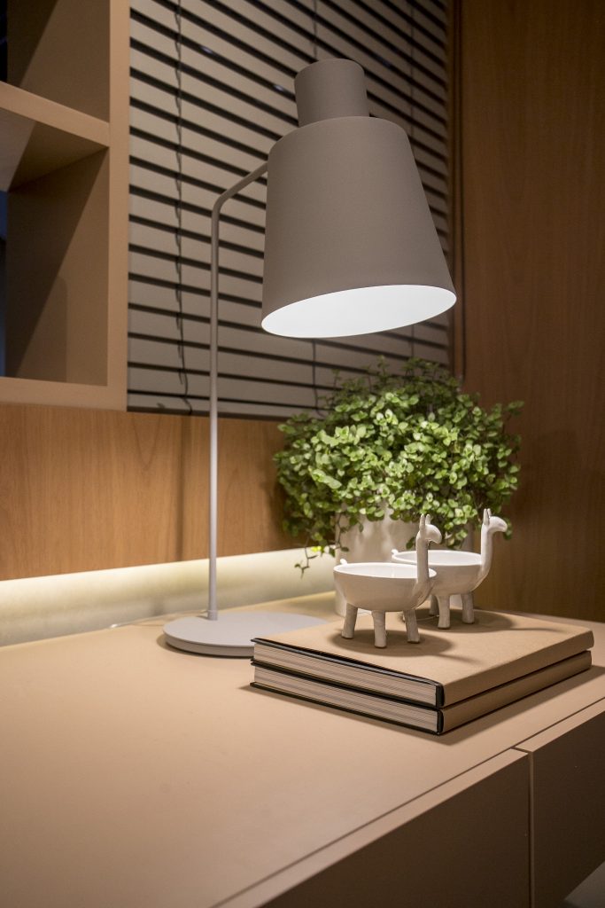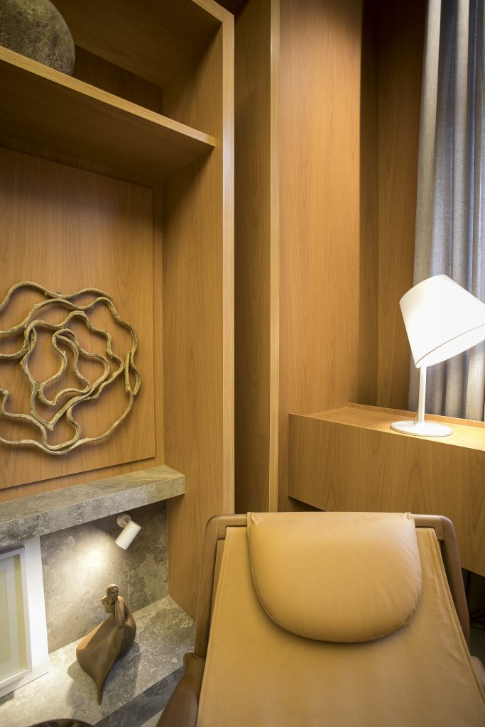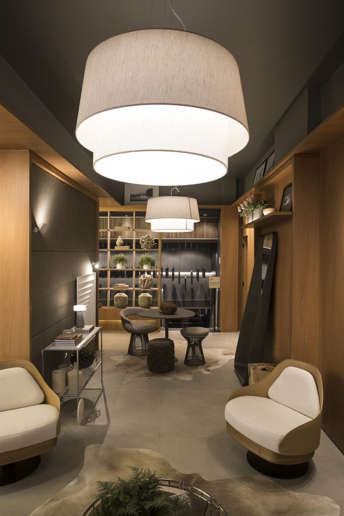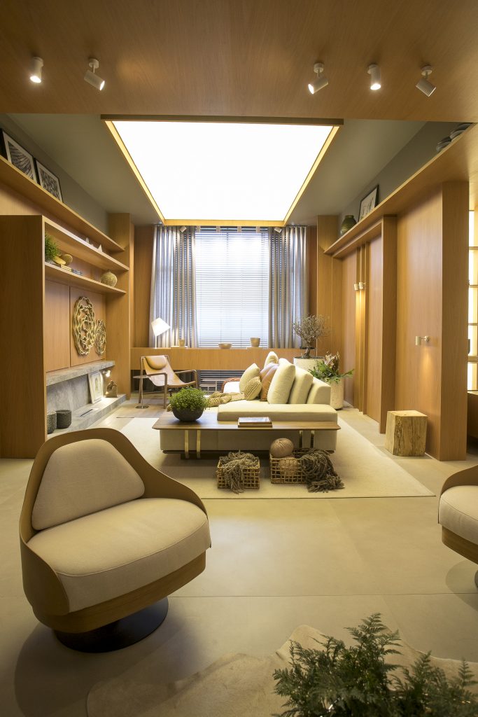 O ambiente é assinado pelos arquitetos Alessandro Cavalcanti e Ricardo Makhoul. Baseado nos sinônimos âmago, cerne e aconchego, o conceito do projeto foi norteado pela busca de essências de conforto e do calor das relações humanas. A proposta apresenta soluções de convivência, trabalho e proximidade entre os usuários. Uma ambientação rica em texturas como a madeira, através do padrão Jequitibá Rosa, lançamento da Coleção Olhares da Duratex para a linha Essencial Wood, que foi aplicado tanto no revestimento das paredes como no teto. A textura das fibras também está presente no revestimento das paredes do lavabo, onde os profissionais usaram o padrão Fibra Nativa, lançamento da linha Quadratta. E para finalizar, o Estar Íntimo Duratex apresenta na marcenaria da mesa do living o padrão Pinole, lançamento da nova coleção para a linha Essencial.