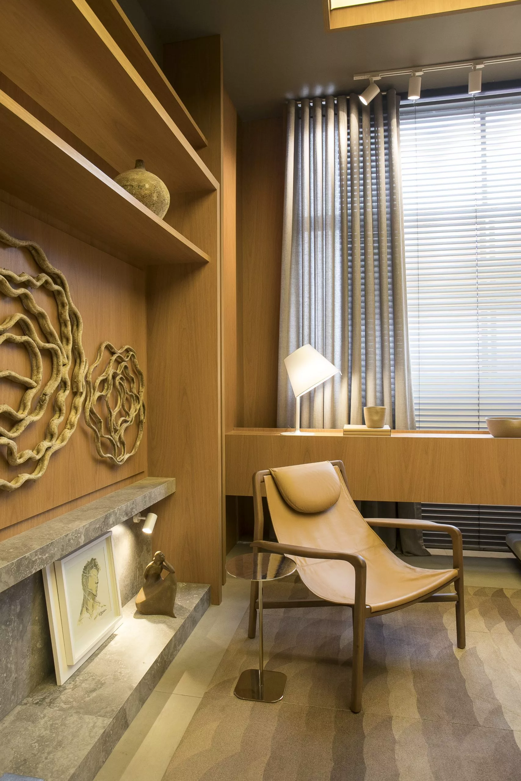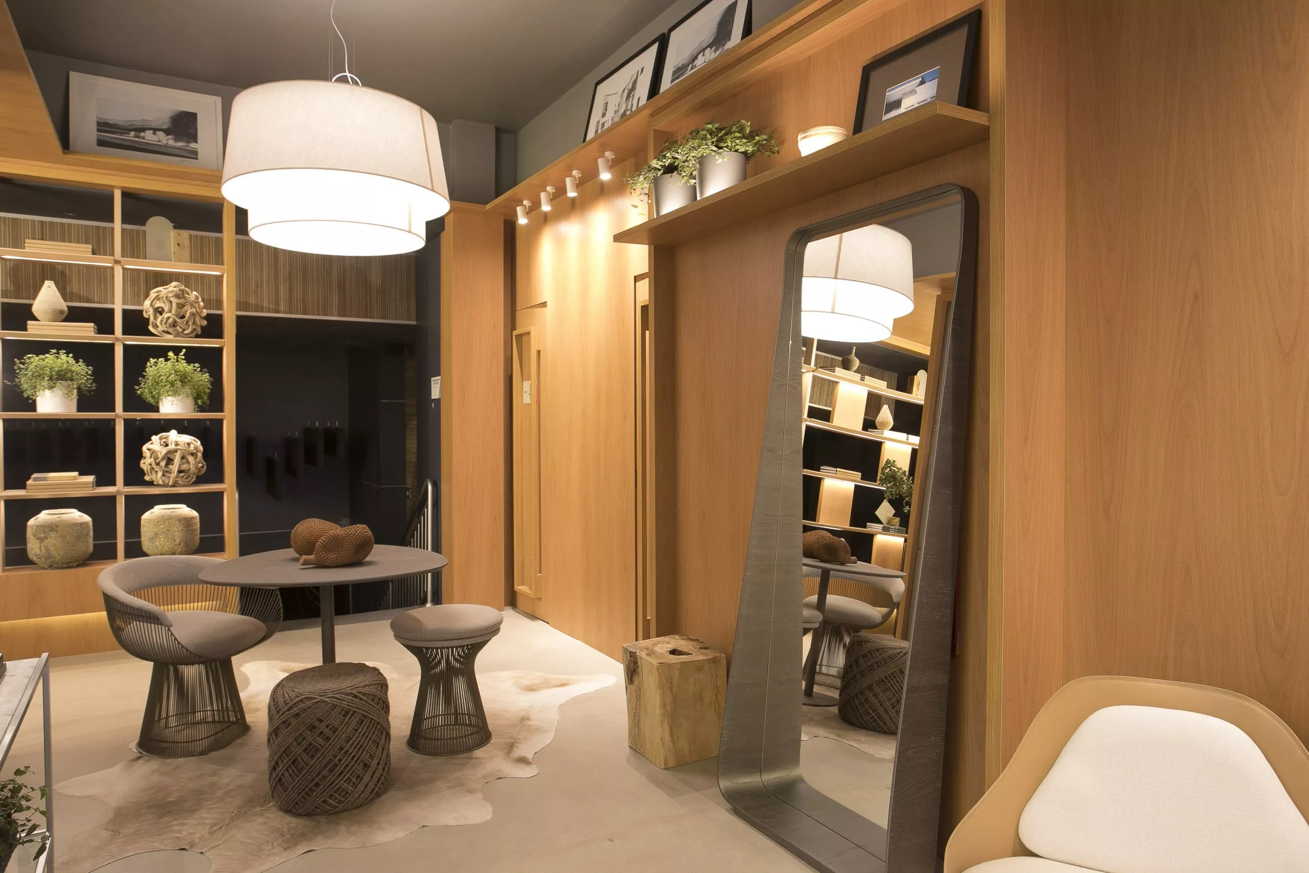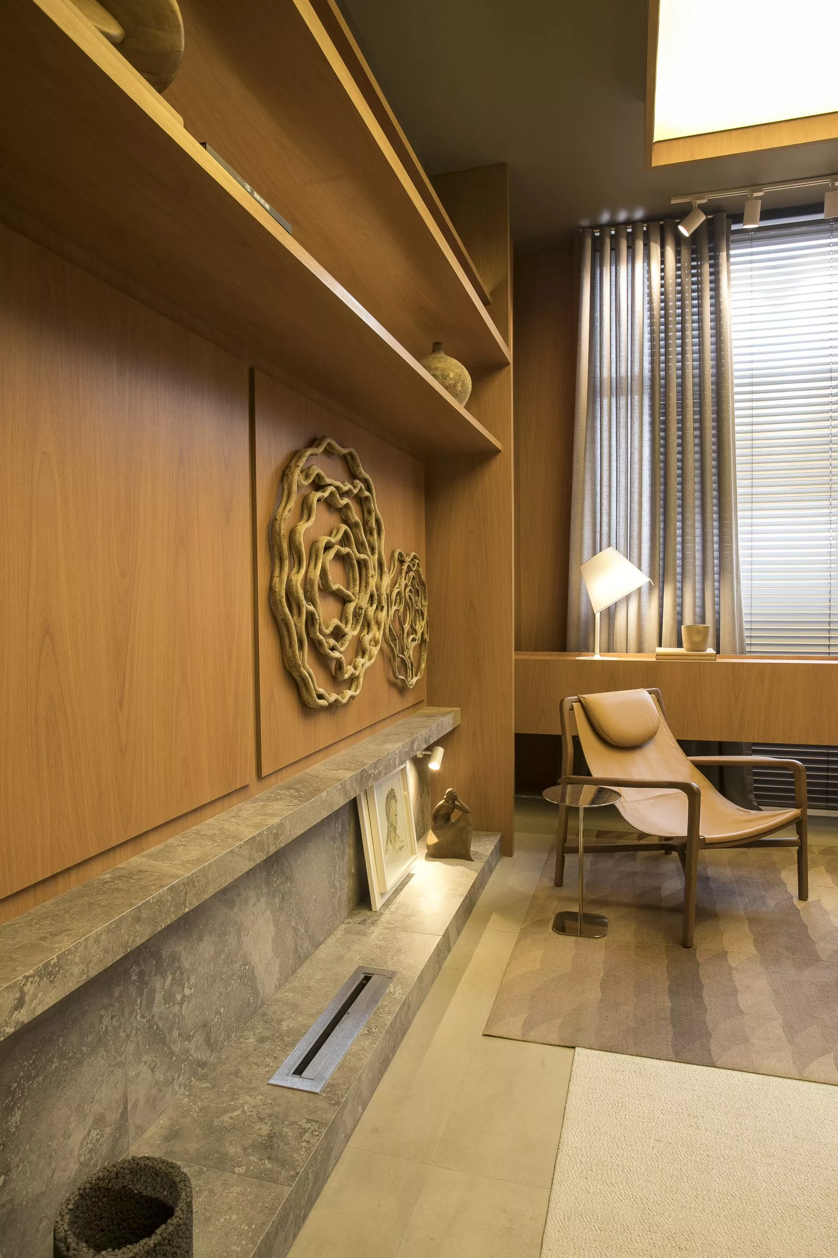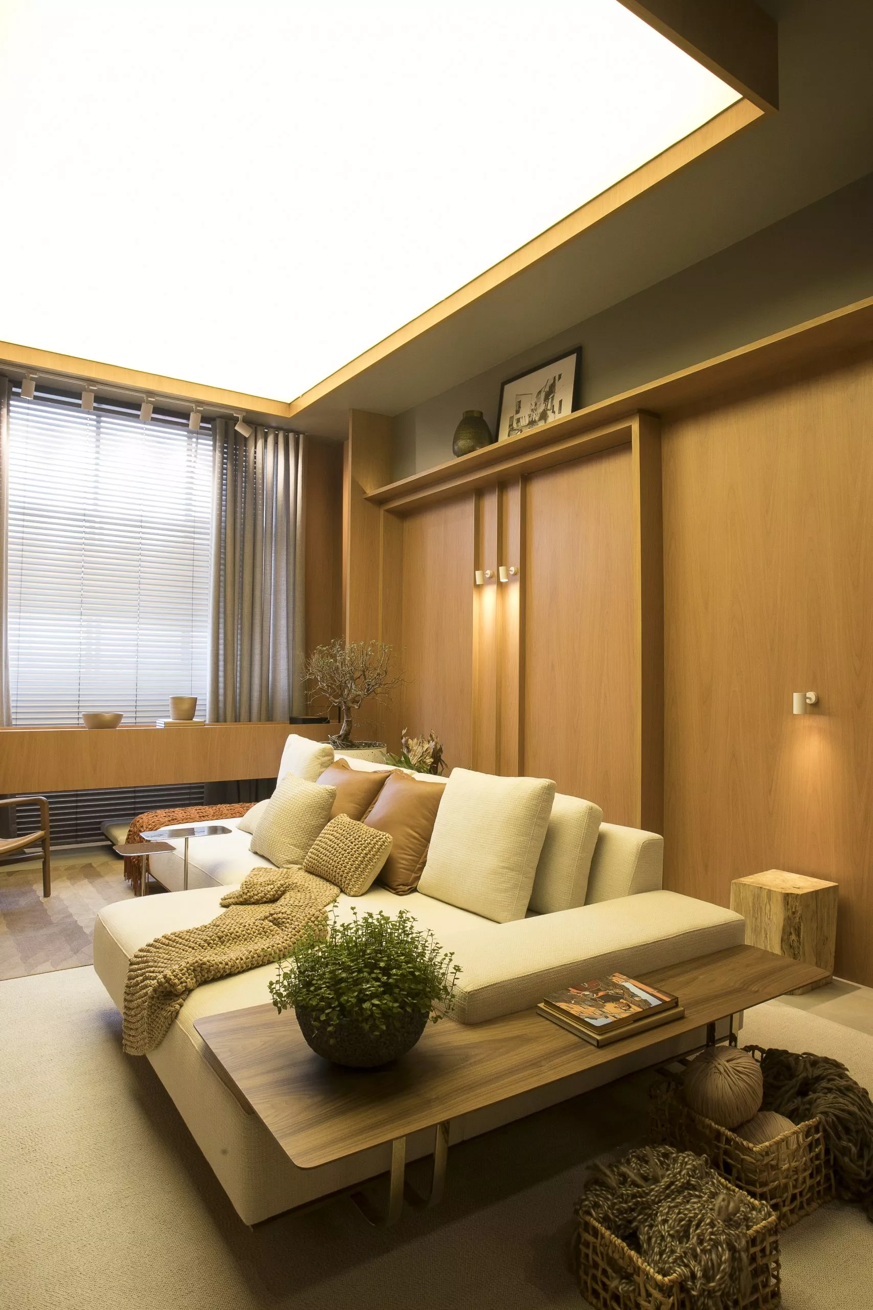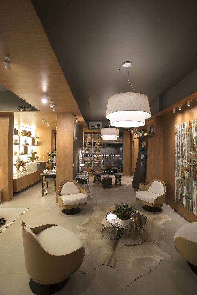 O ambiente é assinado pelos arquitetos Alessandro Cavalcanti e Ricardo Makhoul. Baseado nos sinônimos âmago, cerne e aconchego, o conceito do projeto foi norteado pela busca de essências de conforto e do calor das relações humanas. A proposta apresenta soluções de convivência, trabalho e proximidade entre os usuários. Uma ambientação rica em texturas como a madeira, através do padrão Jequitibá Rosa, lançamento da Coleção Olhares da Duratex para a linha Essencial Wood, que foi aplicado tanto no revestimento das paredes como no teto. A textura das fibras também está presente no revestimento das paredes do lavabo, onde os profissionais usaram o padrão Fibra Nativa, lançamento da linha Quadratta. E para finalizar, o Estar Íntimo Duratex apresenta na marcenaria da mesa do living o padrão Pinole, lançamento da nova coleção para a linha Essencial.
