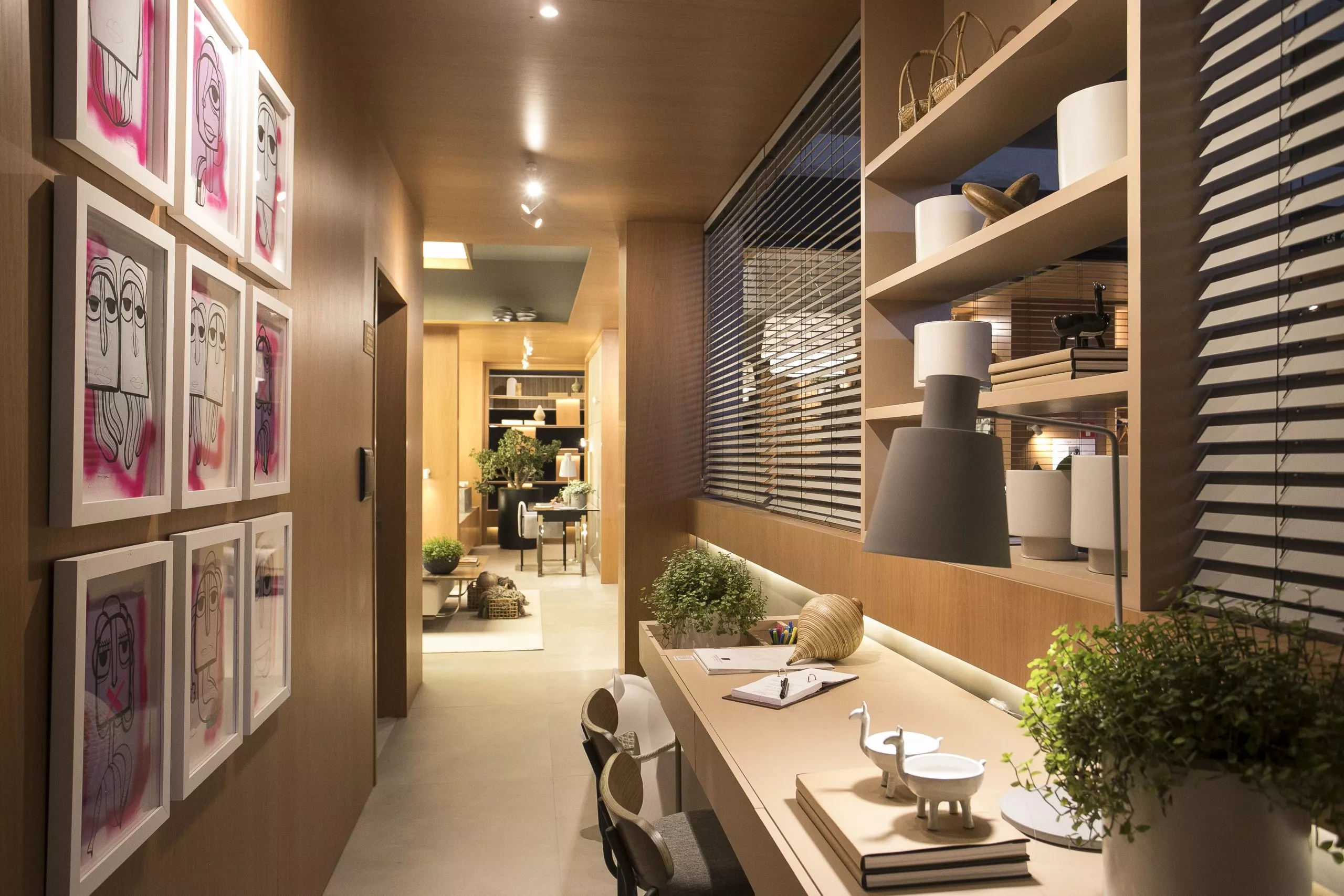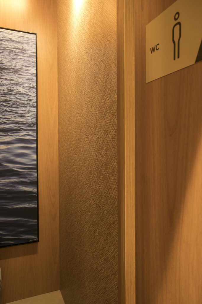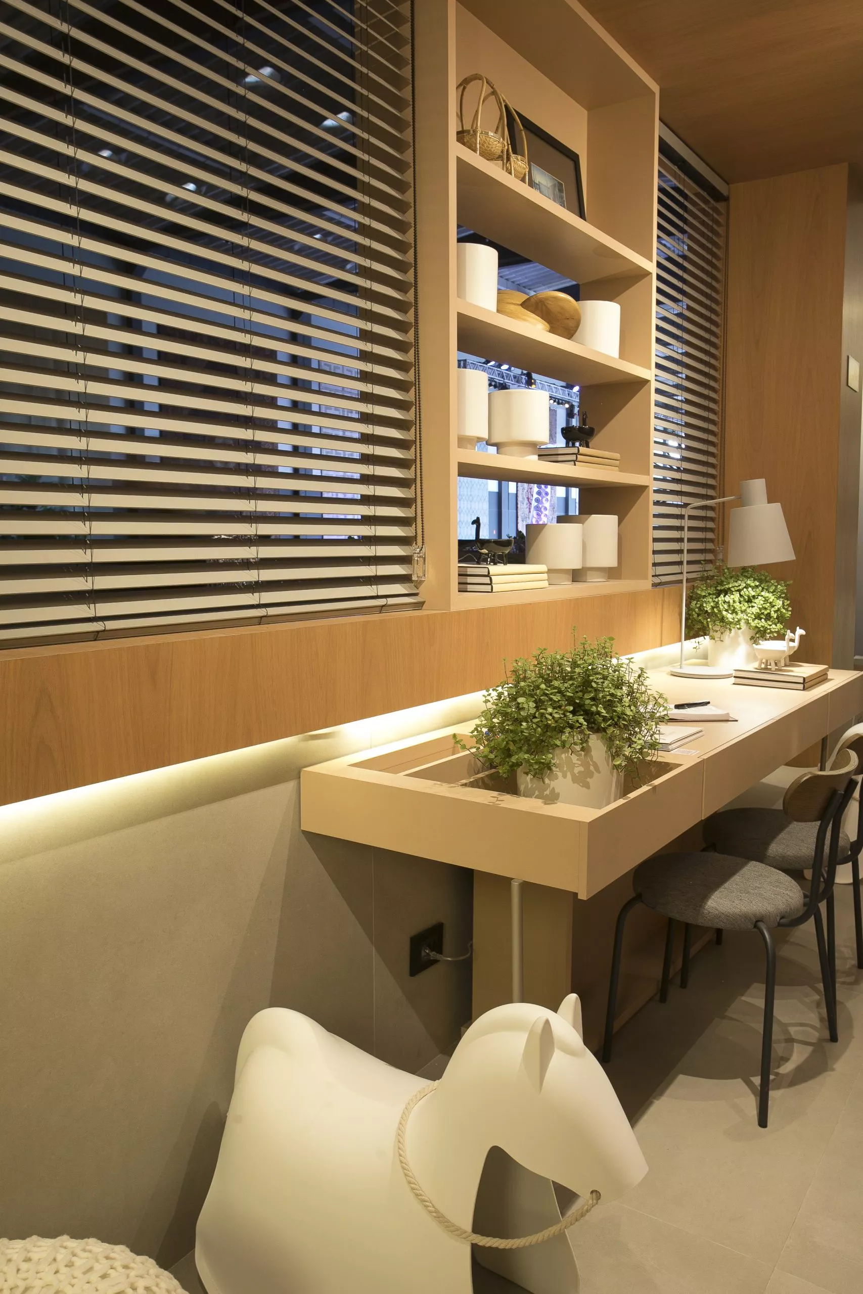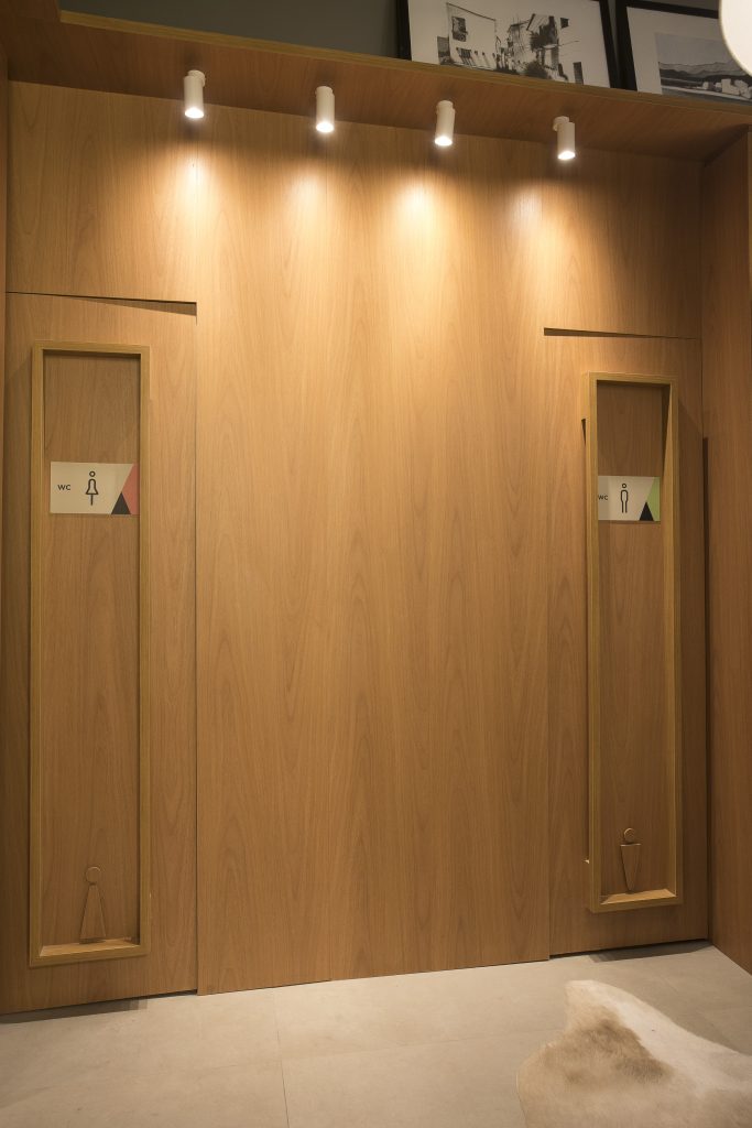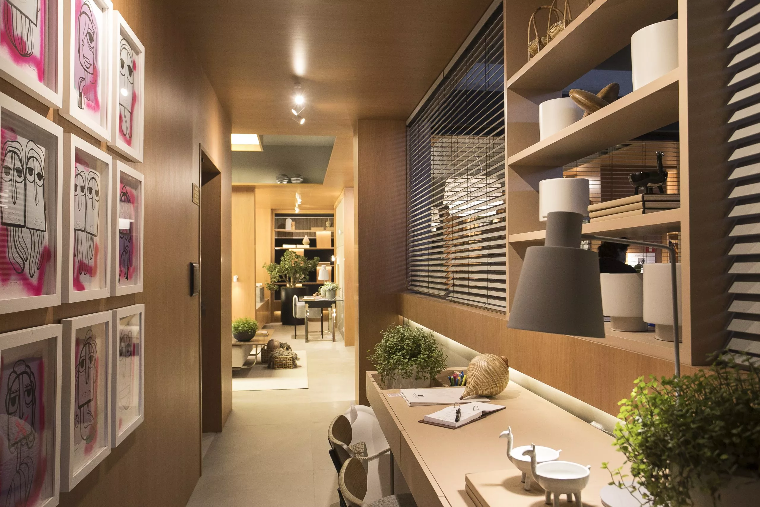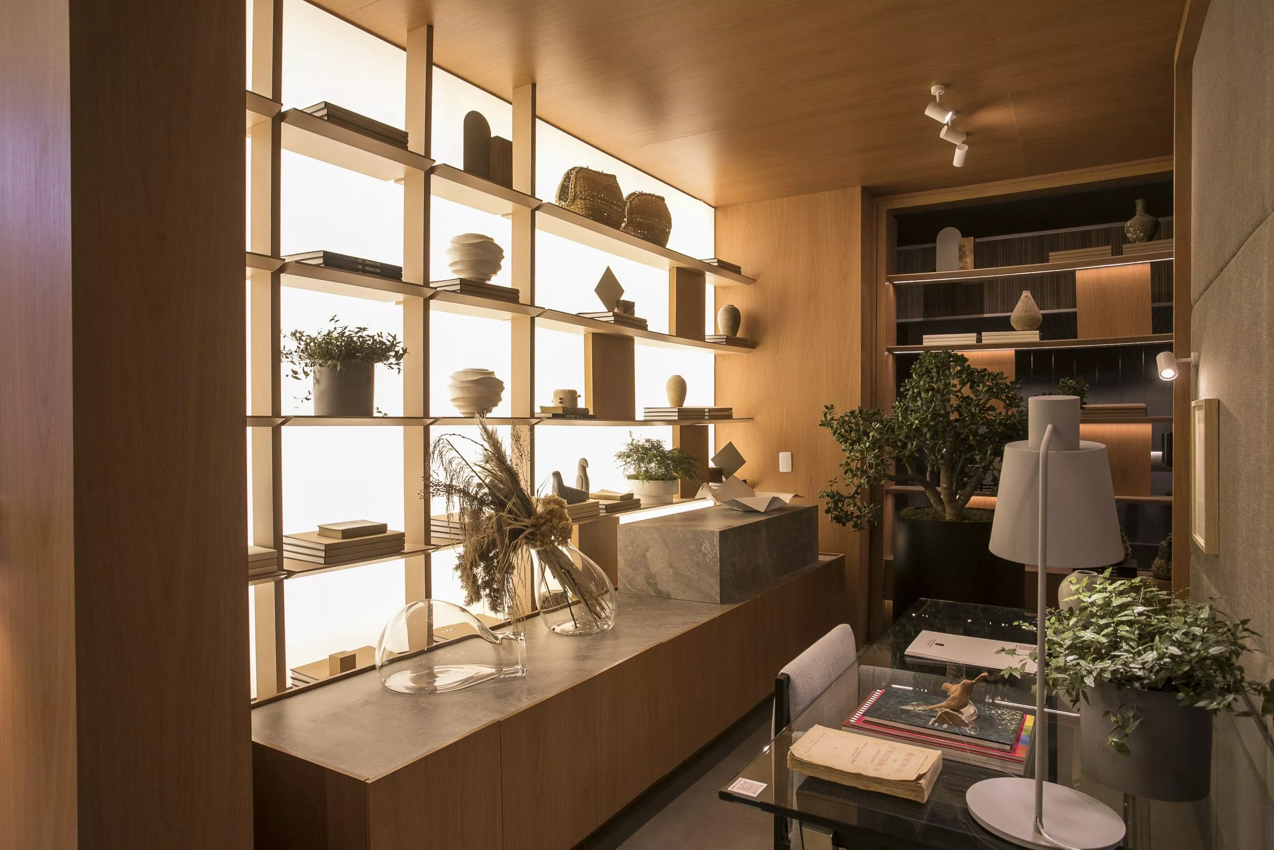 O ambiente é assinado pelos arquitetos Alessandro Cavalcanti e Ricardo Makhoul. Baseado nos sinônimos âmago, cerne e aconchego, o conceito do projeto foi norteado pela busca de essências de conforto e do calor das relações humanas. A proposta apresenta soluções de convivência, trabalho e proximidade entre os usuários. Uma ambientação rica em texturas como a madeira, através do padrão Jequitibá Rosa, lançamento da Coleção Olhares da Duratex para a linha Essencial Wood, que foi aplicado tanto no revestimento das paredes como no teto. A textura das fibras também está presente no revestimento das paredes do lavabo, onde os profissionais usaram o padrão Fibra Nativa, lançamento da linha Quadratta. E para finalizar, o Estar Íntimo Duratex apresenta na marcenaria da mesa do living o padrão Pinole, lançamento da nova coleção para a linha Essencial.
