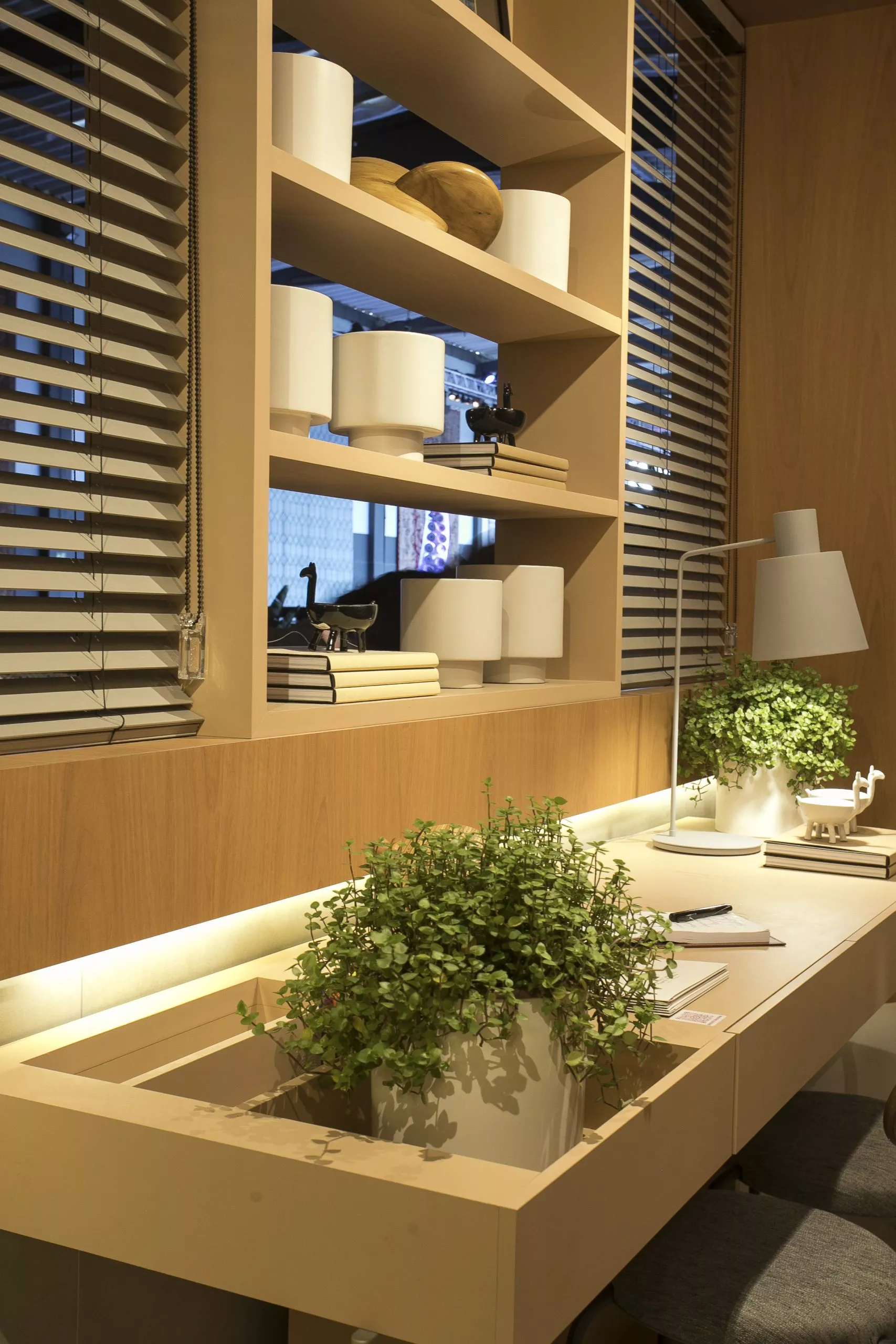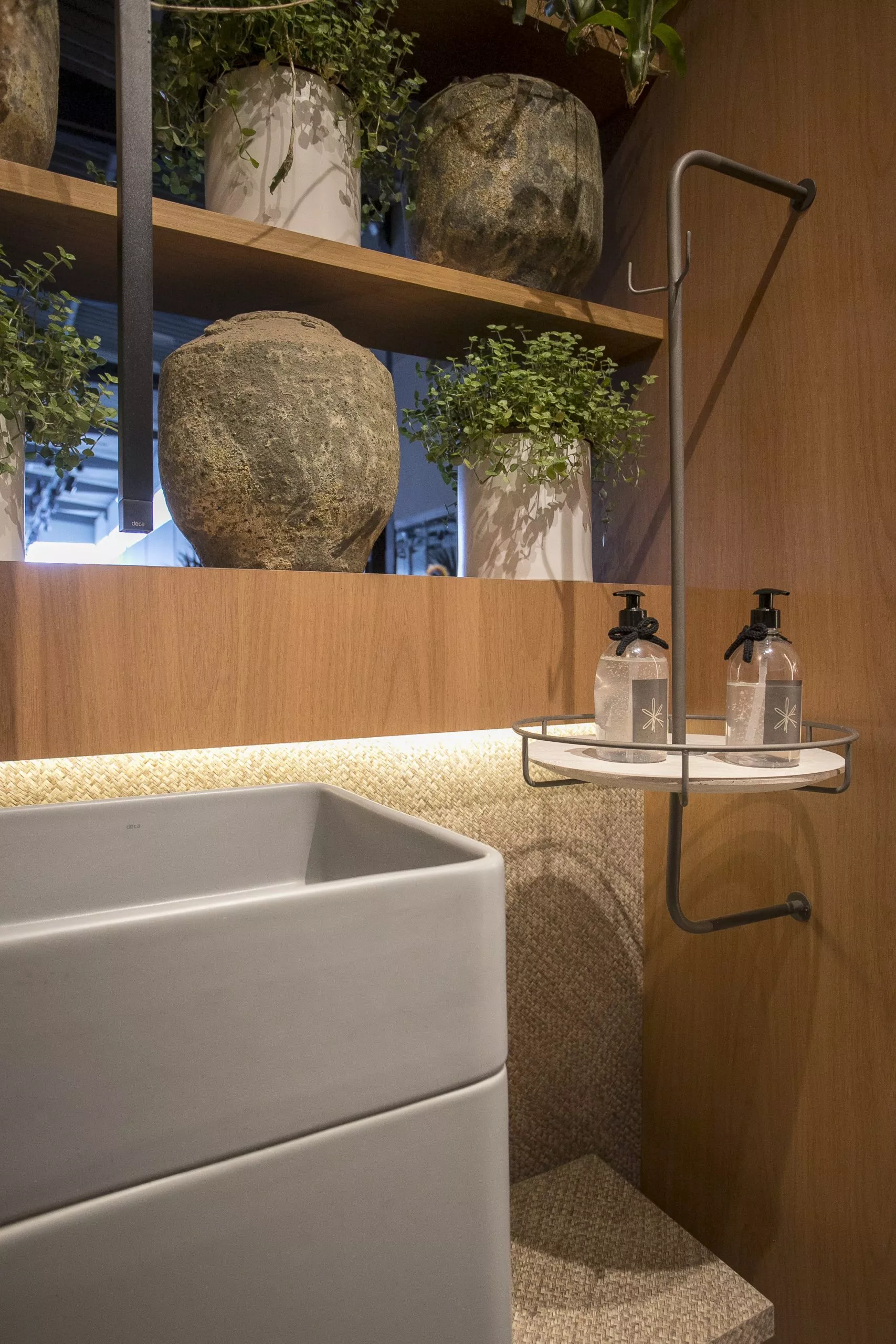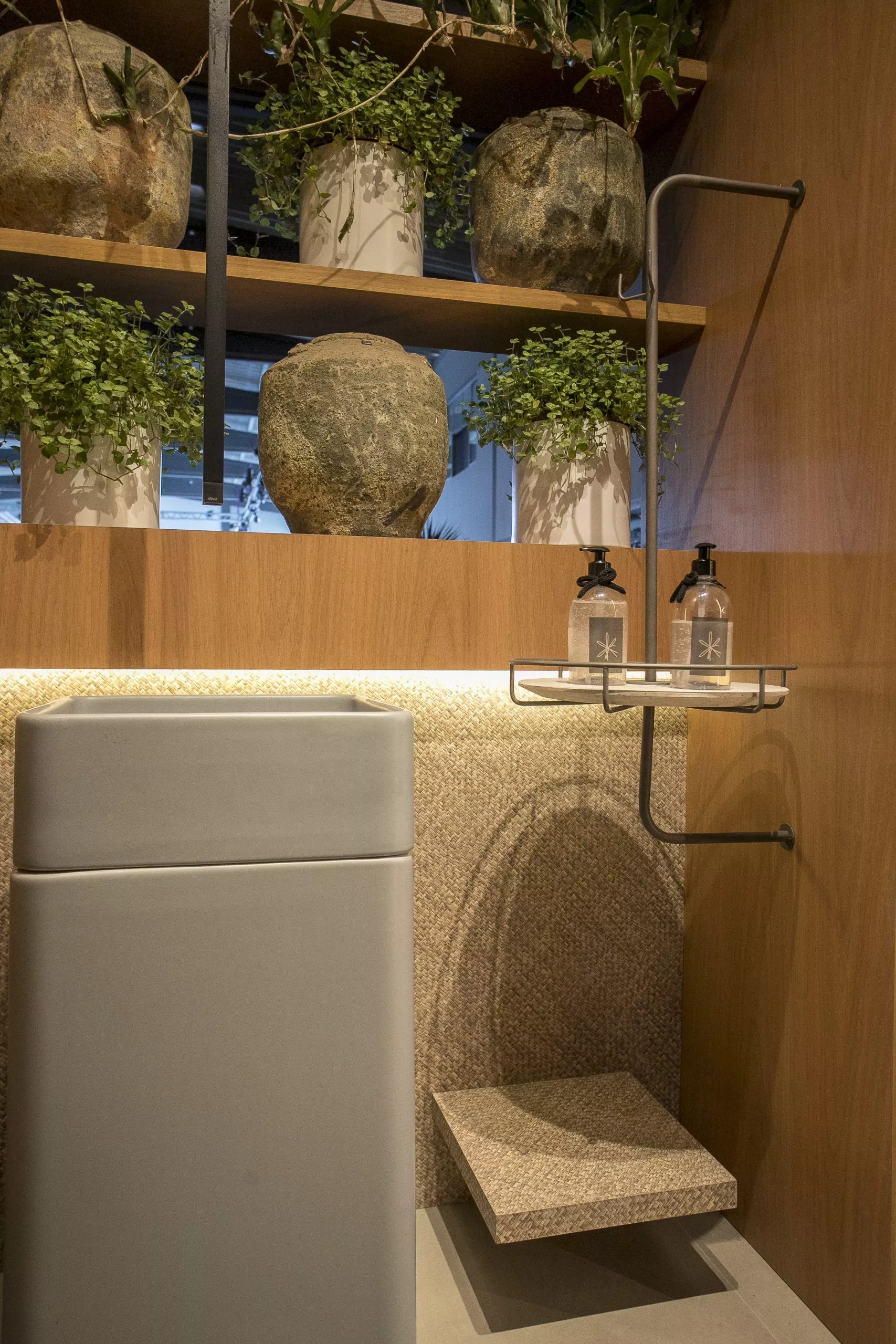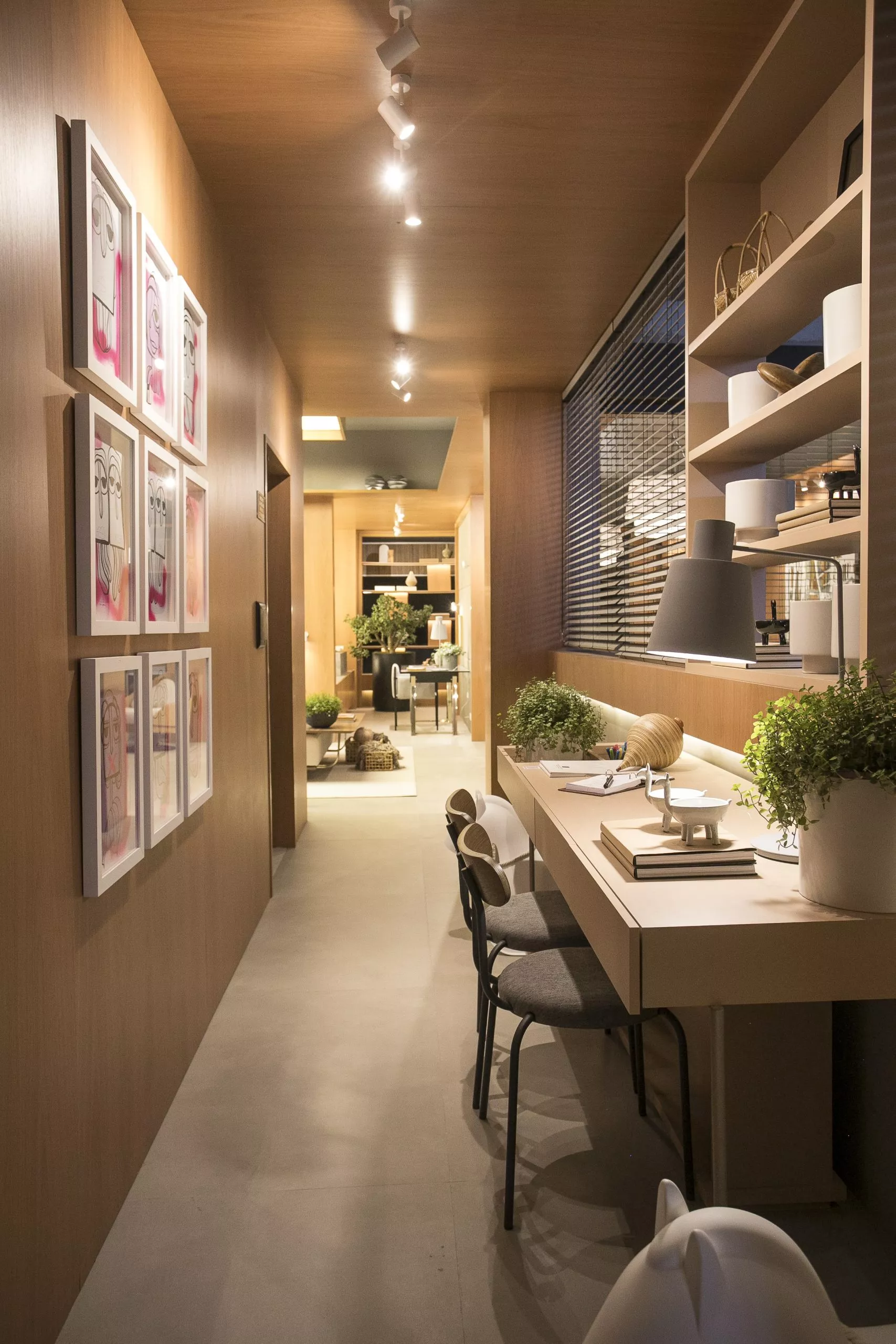 O ambiente é assinado pelos arquitetos Alessandro Cavalcanti e Ricardo Makhoul. Baseado nos sinônimos âmago, cerne e aconchego, o conceito do projeto foi norteado pela busca de essências de conforto e do calor das relações humanas. A proposta apresenta soluções de convivência, trabalho e proximidade entre os usuários. Uma ambientação rica em texturas como a madeira, através do padrão Jequitibá Rosa, lançamento da Coleção Olhares da Duratex para a linha Essencial Wood, que foi aplicado tanto no revestimento das paredes como no teto. A textura das fibras também está presente no revestimento das paredes do lavabo, onde os profissionais usaram o padrão Fibra Nativa, lançamento da linha Quadratta. E para finalizar, o Estar Íntimo Duratex apresenta na marcenaria da mesa do living o padrão Pinole, lançamento da nova coleção para a linha Essencial.