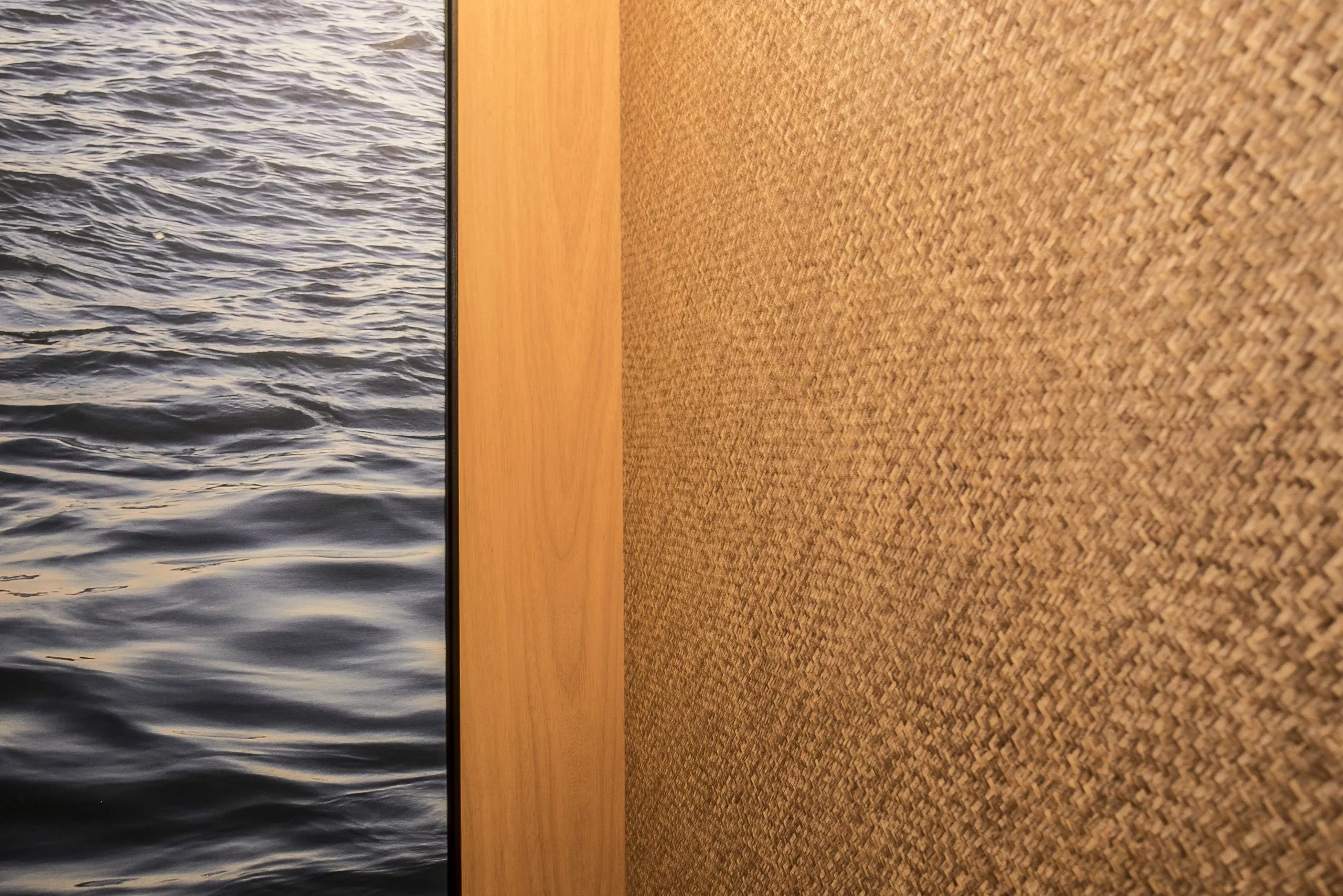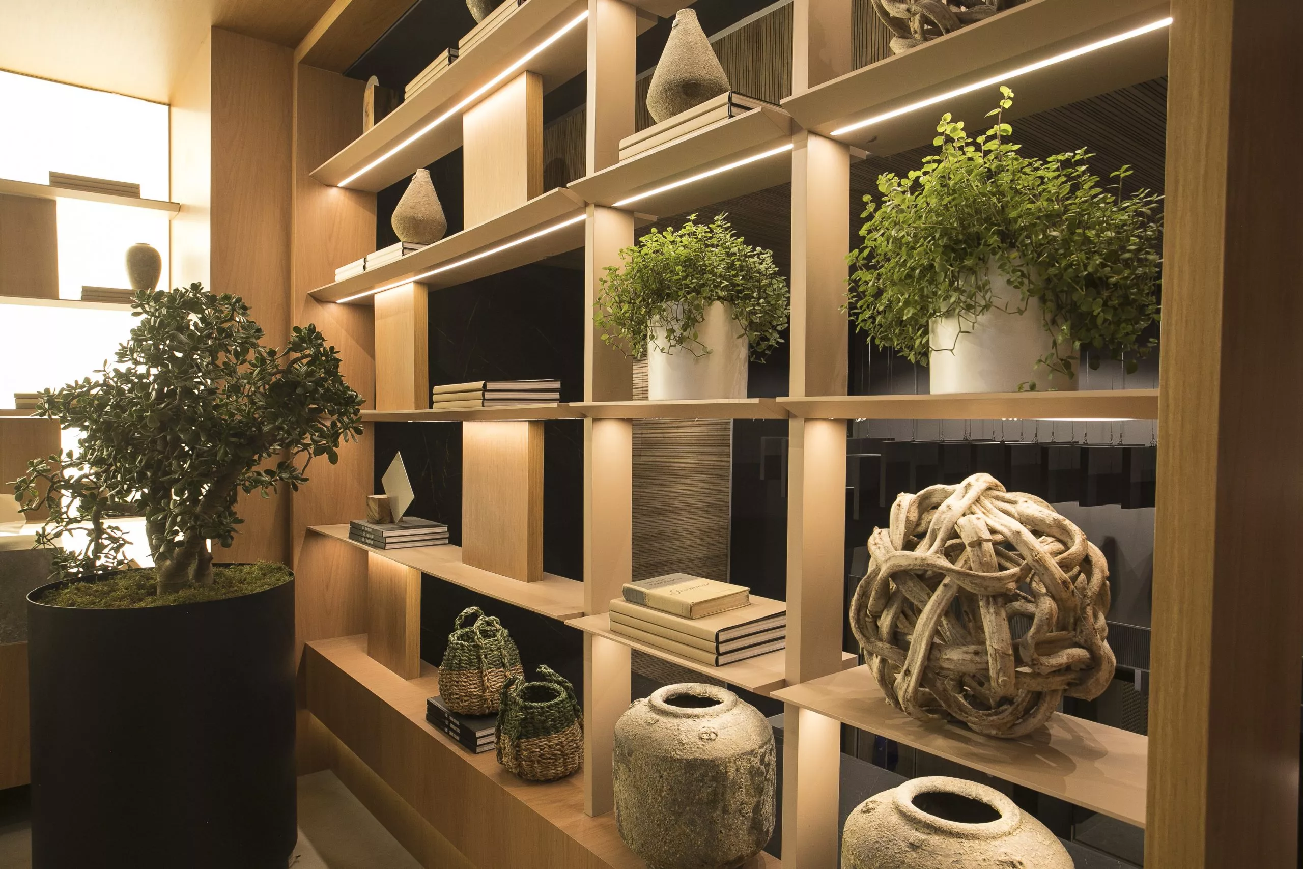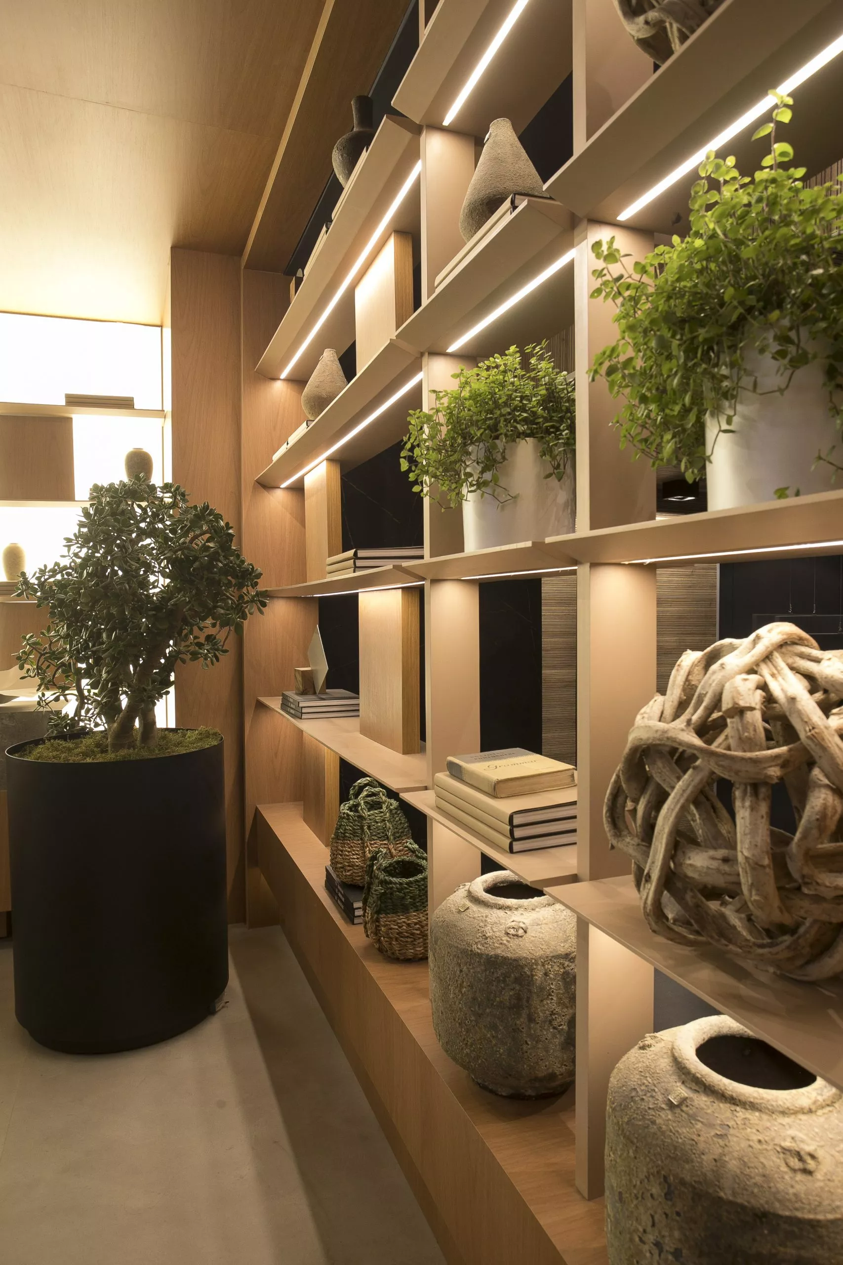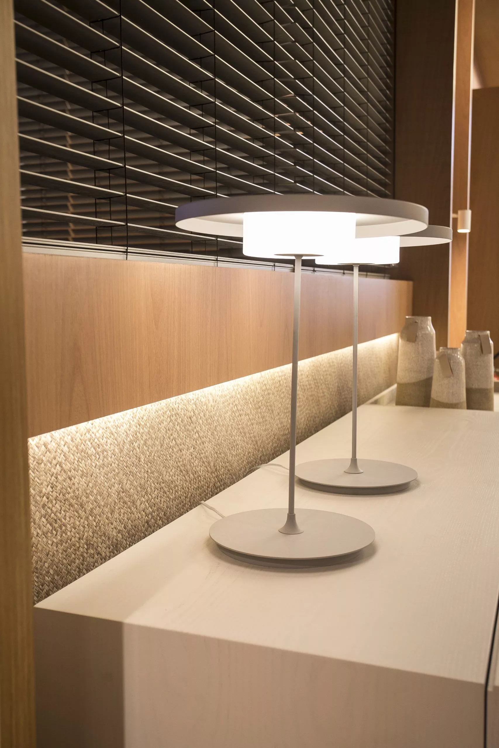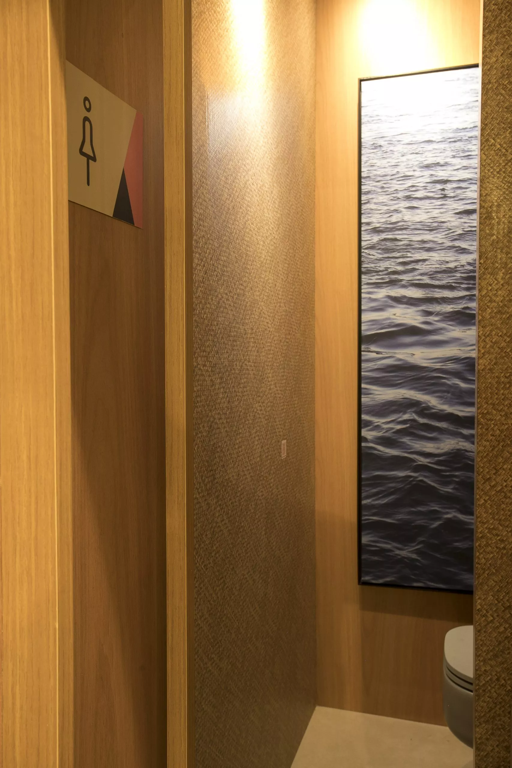 O ambiente é assinado pelos arquitetos Alessandro Cavalcanti e Ricardo Makhoul. Baseado nos sinônimos âmago, cerne e aconchego, o conceito do projeto foi norteado pela busca de essências de conforto e do calor das relações humanas. A proposta apresenta soluções de convivência, trabalho e proximidade entre os usuários. Uma ambientação rica em texturas como a madeira, através do padrão Jequitibá Rosa, lançamento da Coleção Olhares da Duratex para a linha Essencial Wood, que foi aplicado tanto no revestimento das paredes como no teto. A textura das fibras também está presente no revestimento das paredes do lavabo, onde os profissionais usaram o padrão Fibra Nativa, lançamento da linha Quadratta. E para finalizar, o Estar Íntimo Duratex apresenta na marcenaria da mesa do living o padrão Pinole, lançamento da nova coleção para a linha Essencial.