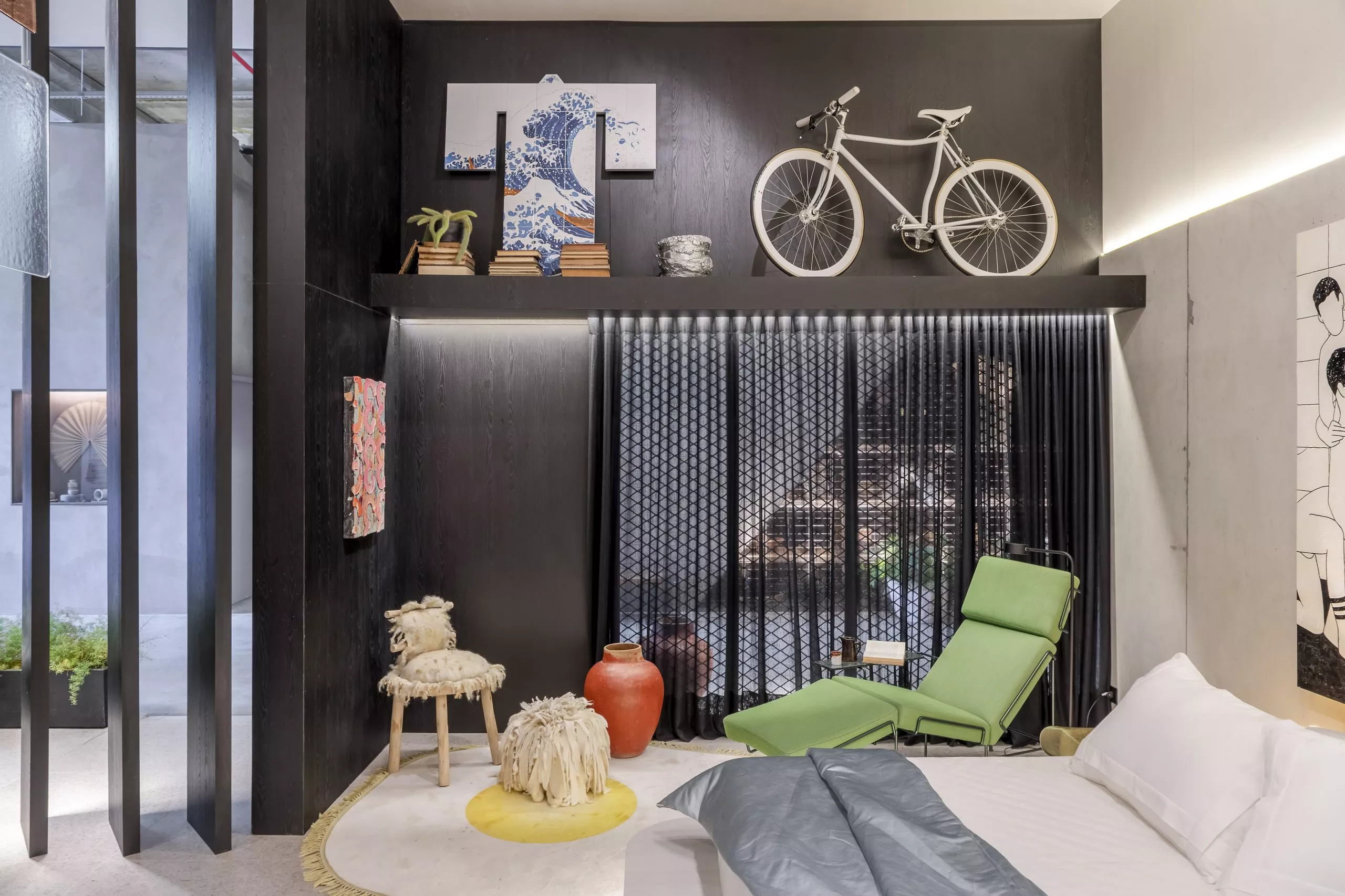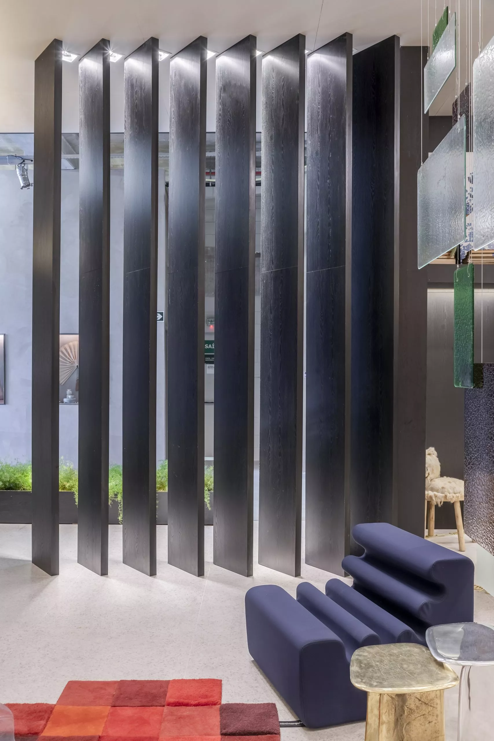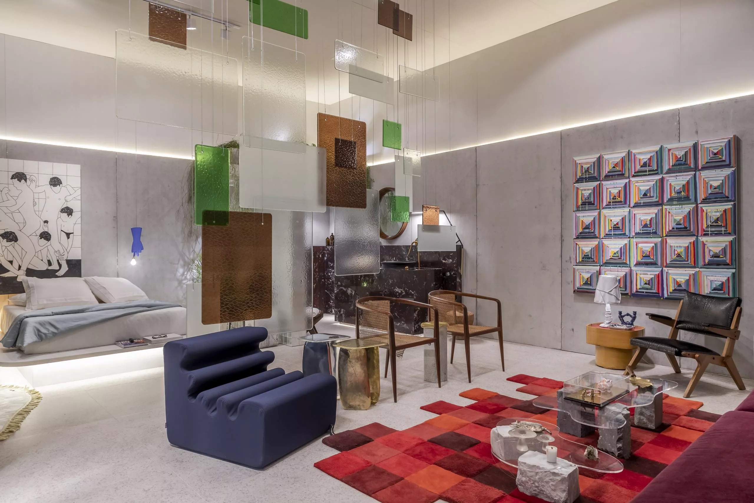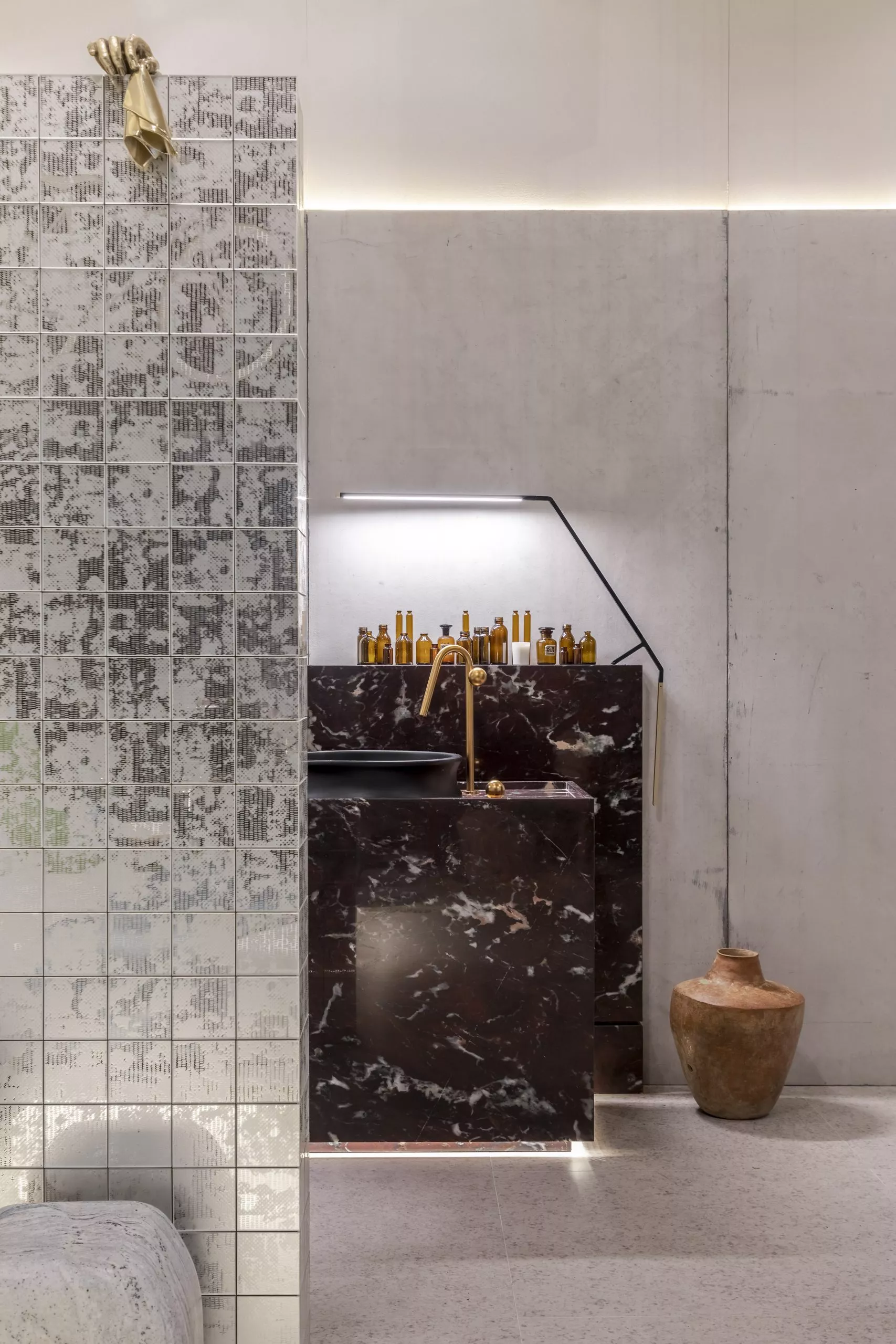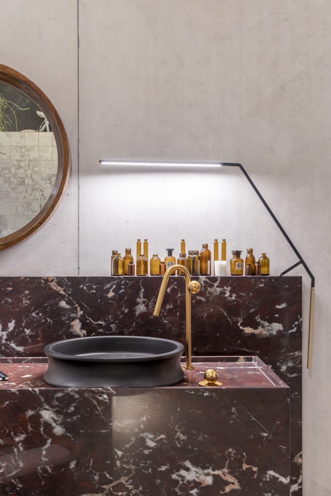 O estúdio de 60m² marca a estreia do arquiteto Pedro Luiz de Marqui na CASACOR. Com a proposta de manter a liberdade criativa, apegando-se ao emocional, lúdico e extravagante, o Estúdio Liberdade traz materiais que se contrapõem, representando o passado e o presente, como uma caverna contemporânea. Mármore brasileiro, cimento, alumínio, bronze, tecidos de lã e veludo e detalhes em barro e madeira estão entre as escolhas. O padrão Absoluto, lançamento da linha Conceito, aparece no revestimento da fachada do ambiente, bem como nos brises que permeiam a entrada.
