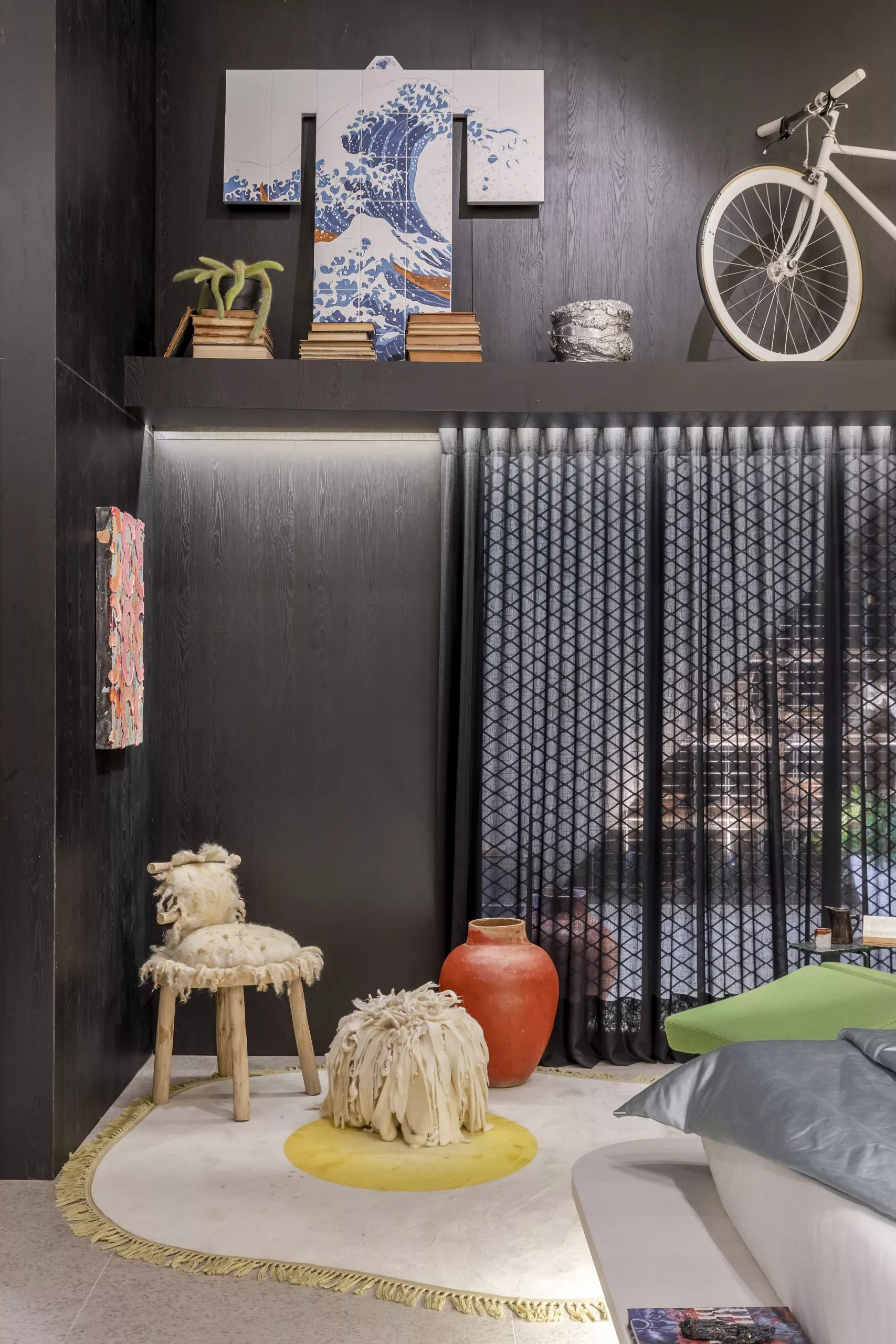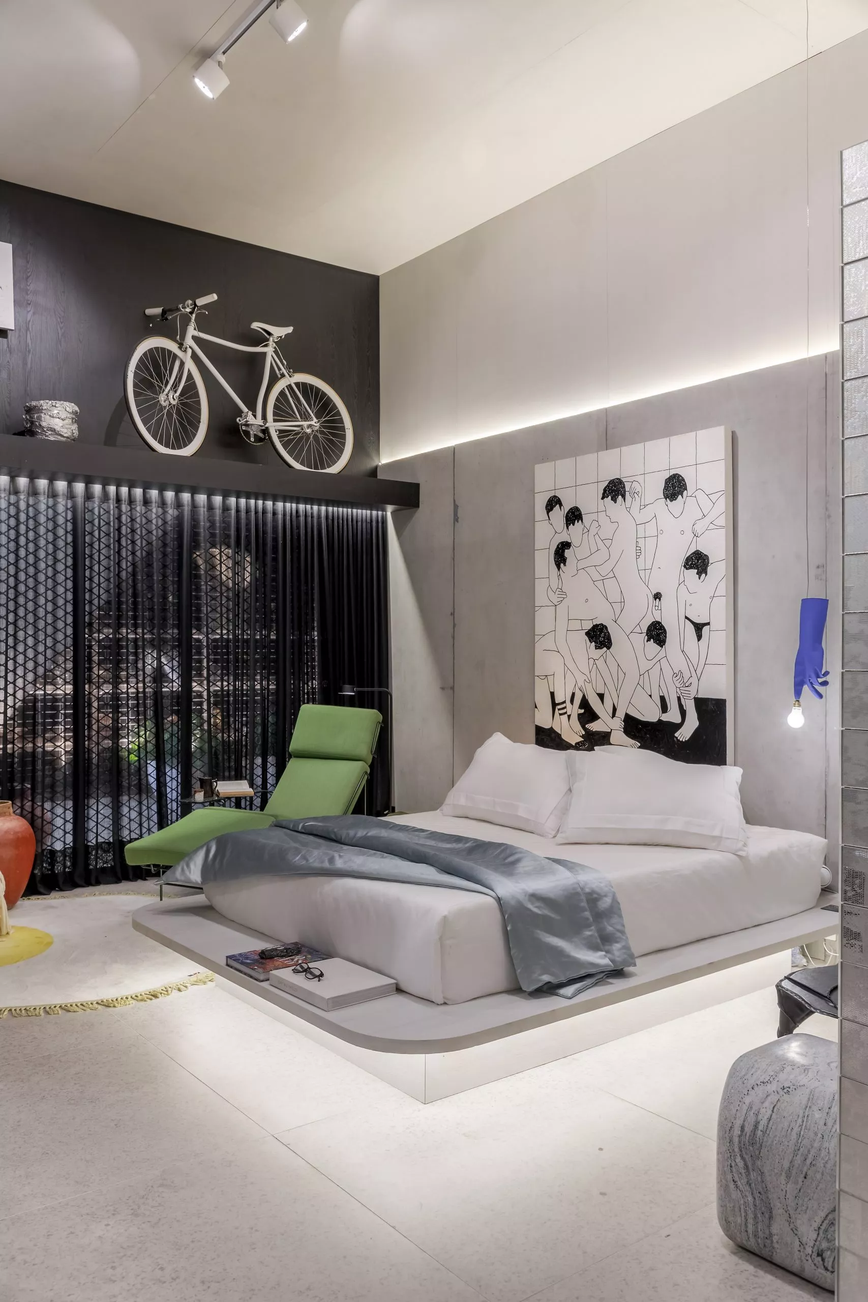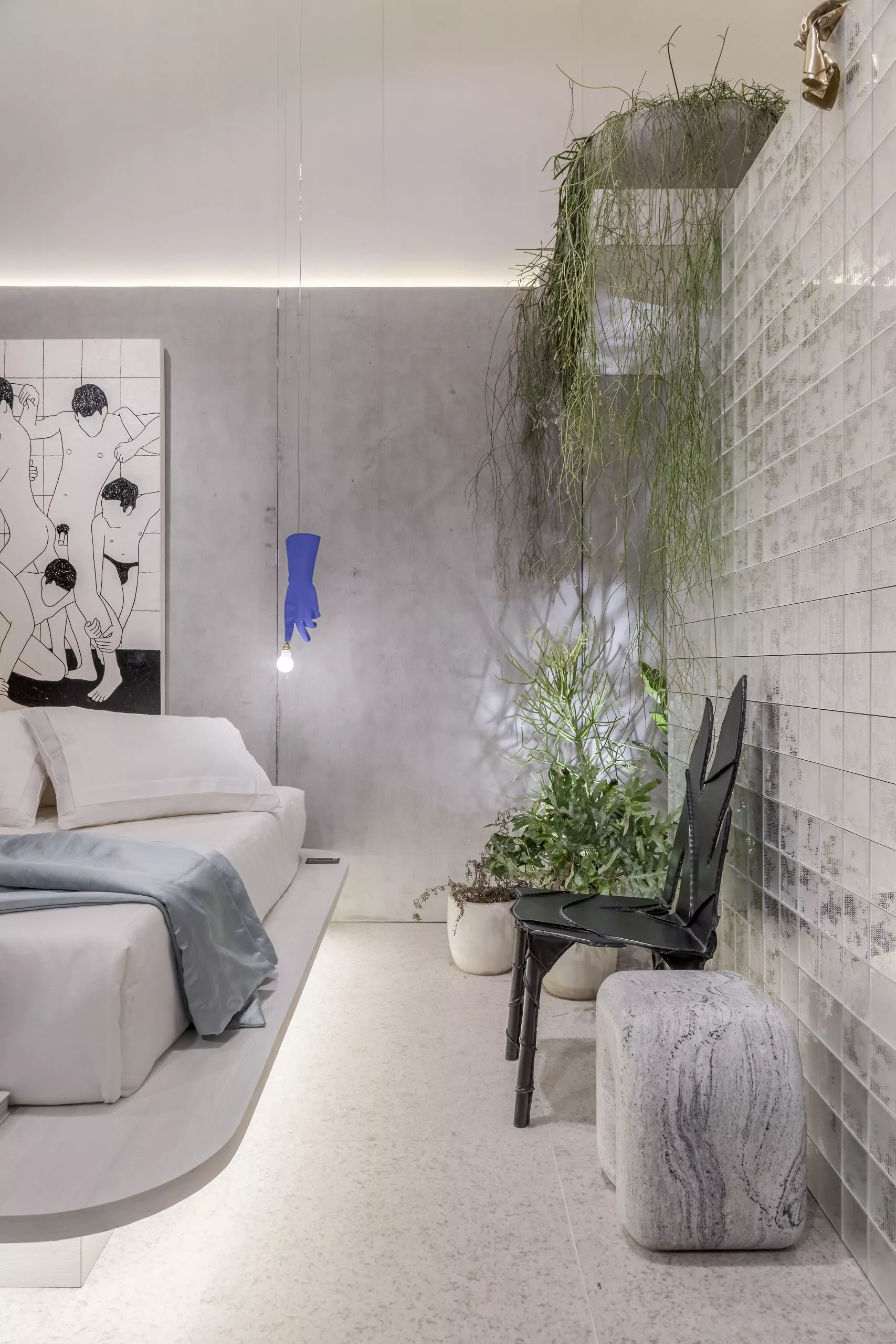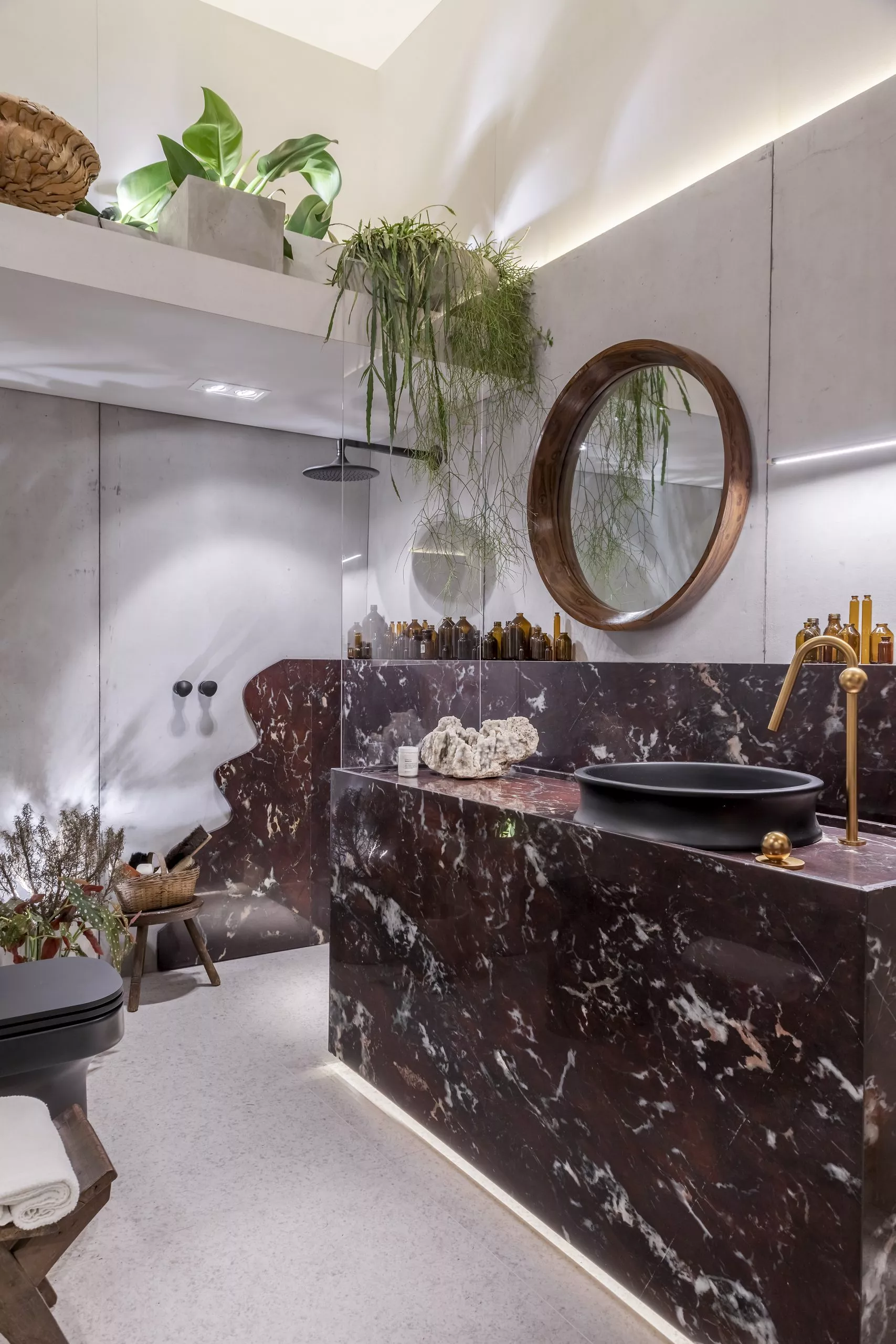O estúdio de 60m² marca a estreia do arquiteto Pedro Luiz de Marqui na CASACOR. Com a proposta de manter a liberdade criativa, apegando-se ao emocional, lúdico e extravagante, o Estúdio Liberdade traz materiais que se contrapõem, representando o passado e o presente, como uma caverna contemporânea. Mármore brasileiro, cimento, alumínio, bronze, tecidos de lã e veludo e detalhes em barro e madeira estão entre as escolhas. O padrão Absoluto, lançamento da linha Conceito, aparece no revestimento da fachada do ambiente, bem como nos brises que permeiam a entrada.