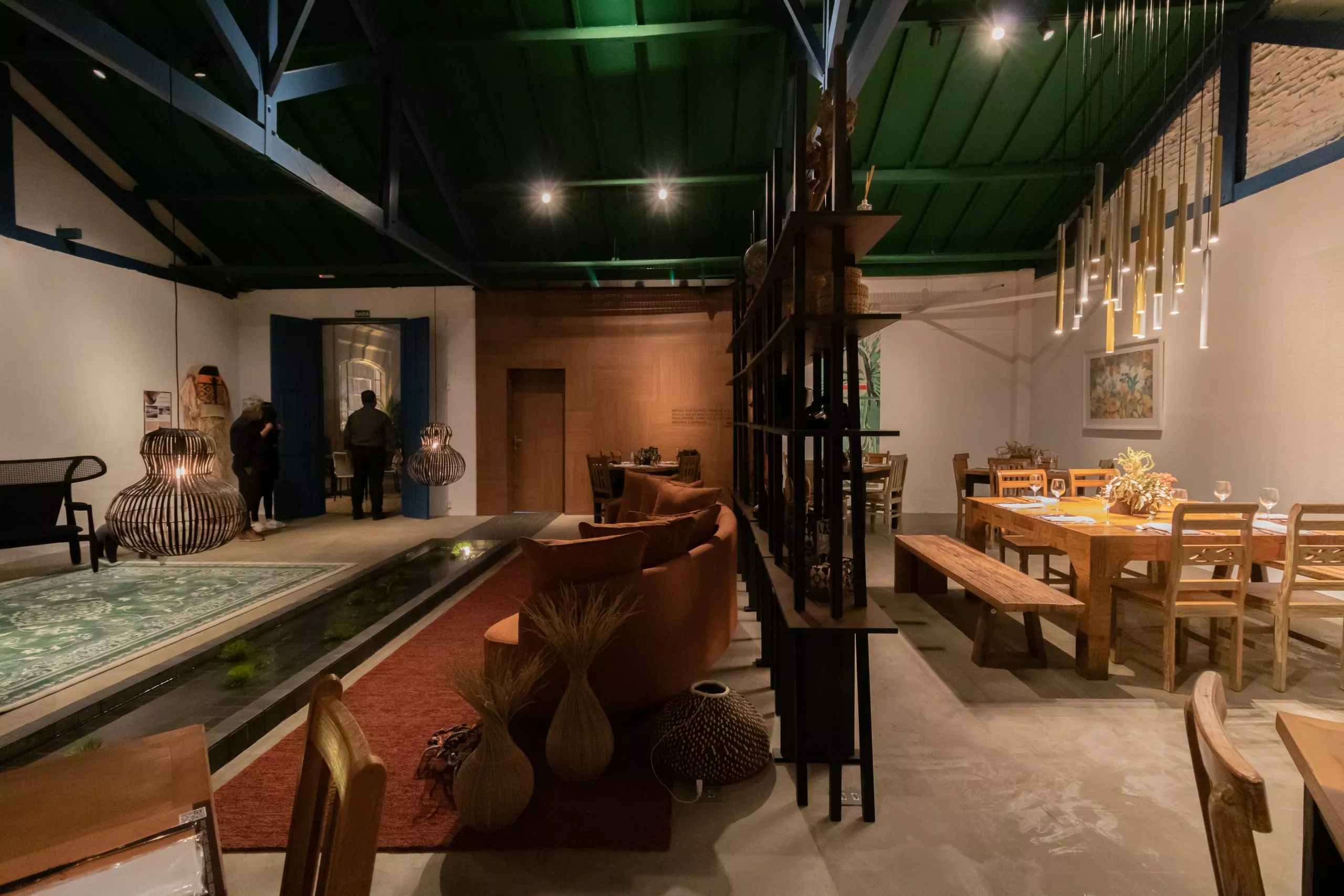 Aldomar Caprini, que assina o “Restaurante Sem Eira nem Beira”, buscou referências na brasilidade e especificou o padrão Nogueira Caiena, da linha Design, que é uma madeira escura com tons de mel, como ponto central do projeto, revestindo paredes e teto. A ideia é trazer uma reflexão sobre as riquezas naturais de flora brasileira, assim como as riquezas minerais. Nesse caso, o arquiteto optou pelo padrão Steel, da linha Essencial, referência ao metal, para produzir as prateleiras.