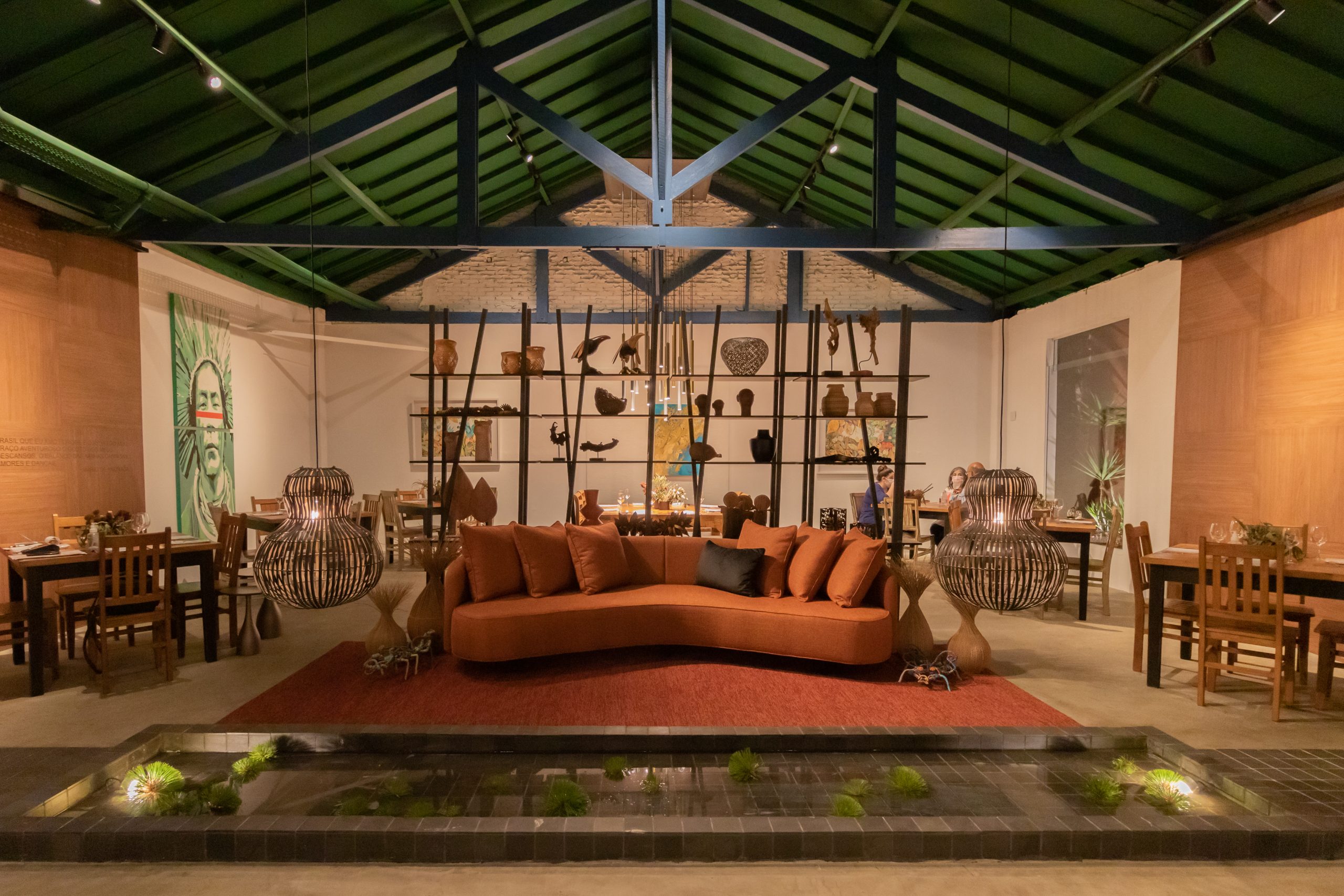 Aldomar Caprini, que assina o “Restaurante Sem Eira nem Beira”, buscou referências na brasilidade e especificou o padrão Nogueira Caiena, da linha Design, que é uma madeira escura com tons de mel, como ponto central do projeto, revestindo paredes e teto. A ideia é trazer uma reflexão sobre as riquezas naturais de flora brasileira, assim como as riquezas minerais. Nesse caso, o arquiteto optou pelo padrão Steel, da linha Essencial, referência ao metal, para produzir as prateleiras.