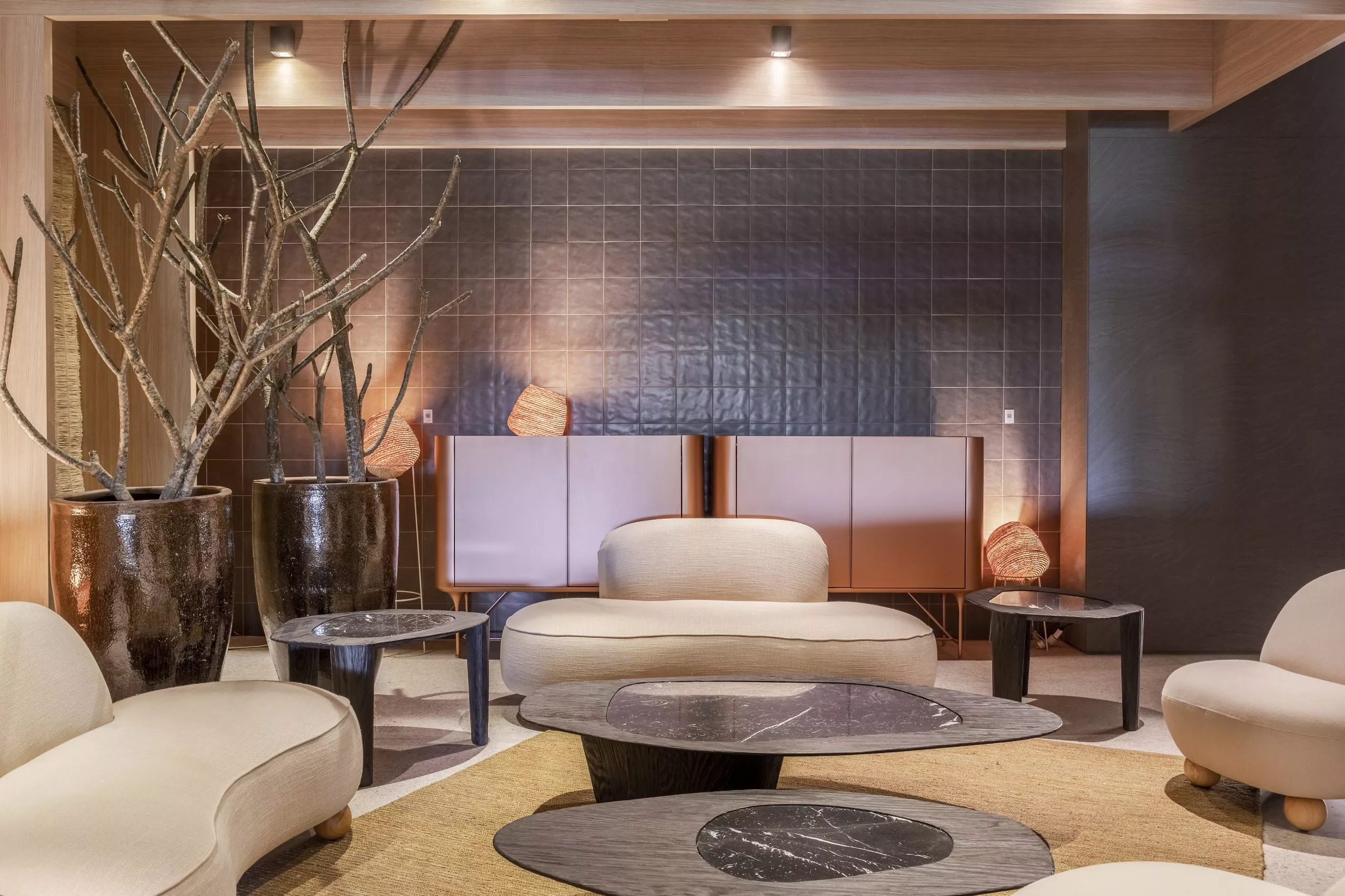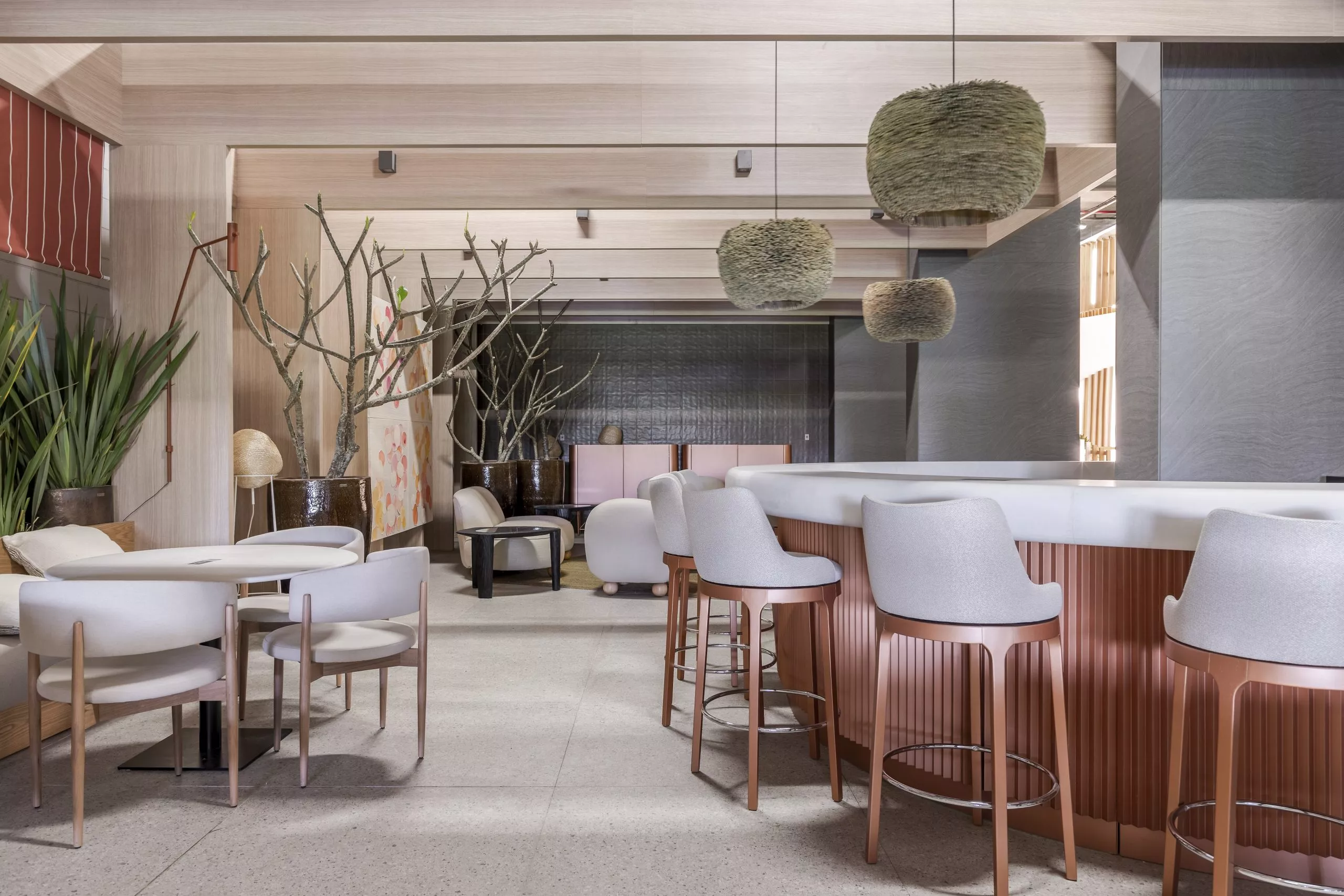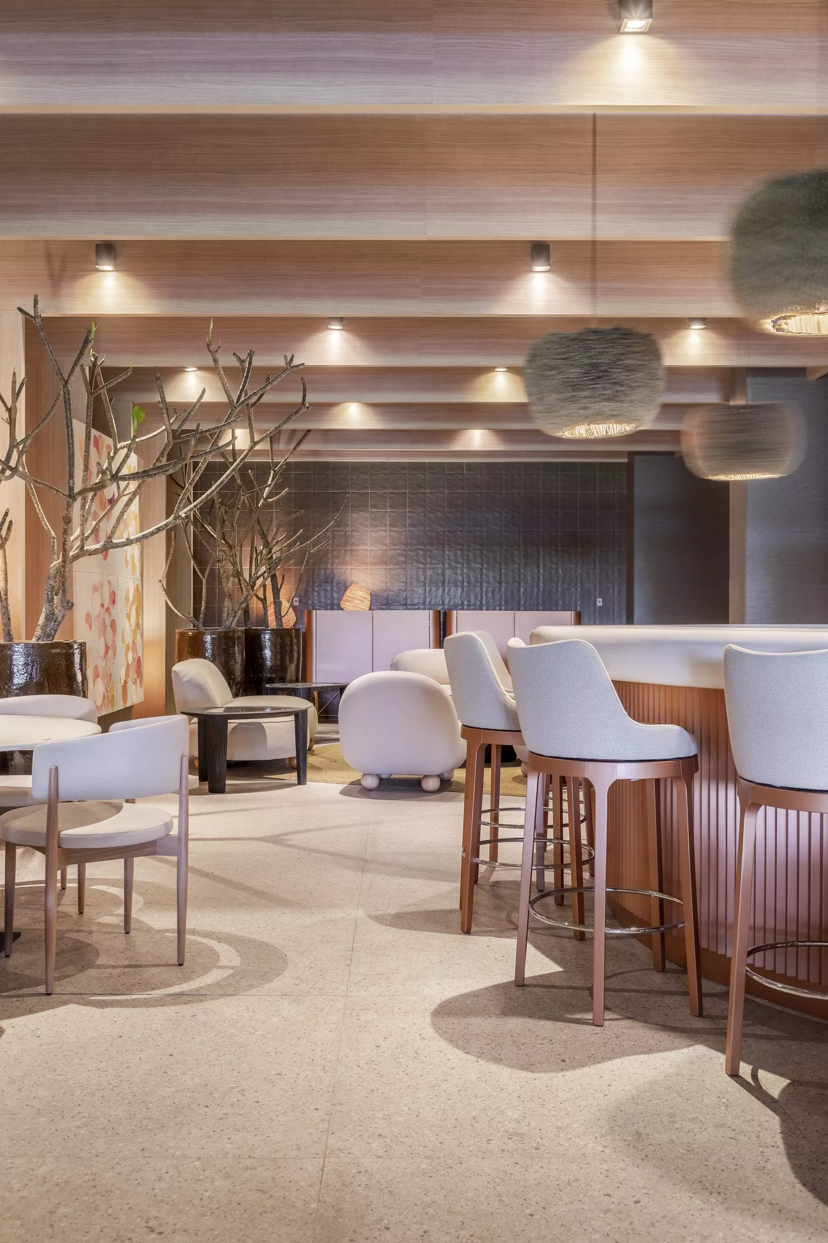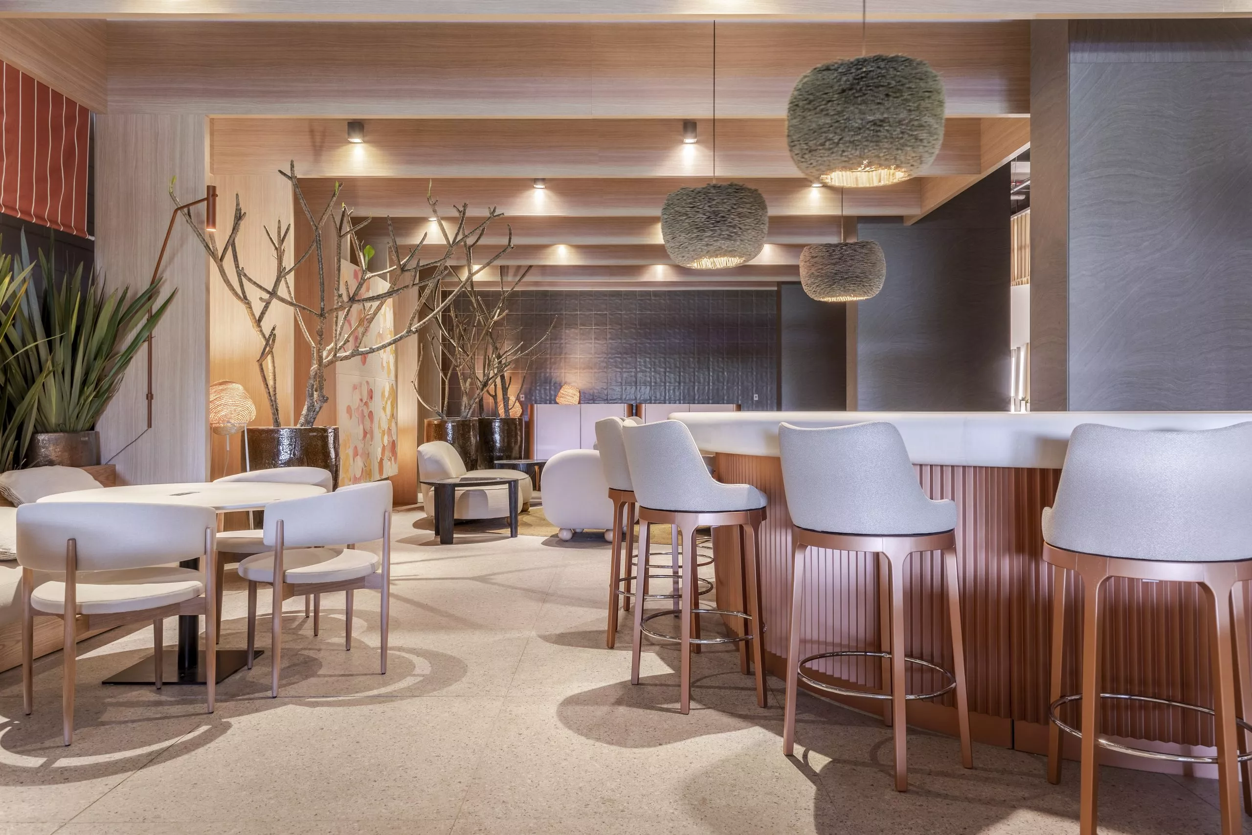 Alinhada com a necessidade de um amplo ambiente arejado e ventilado, o arquiteto Tufi Mousse criou o projeto do Restaurante Terraço, de 366m², traz arquitetura leve e conectada à paisagem externa. Pórticos e pergolados estruturados em metal e revestidos com os padrões Carvalho Batur e Basalto, respectivamente, das linhas Essencial Wood e Conceito, geram uma geometria que define o espaço e demarca em contornos todo o projeto.
