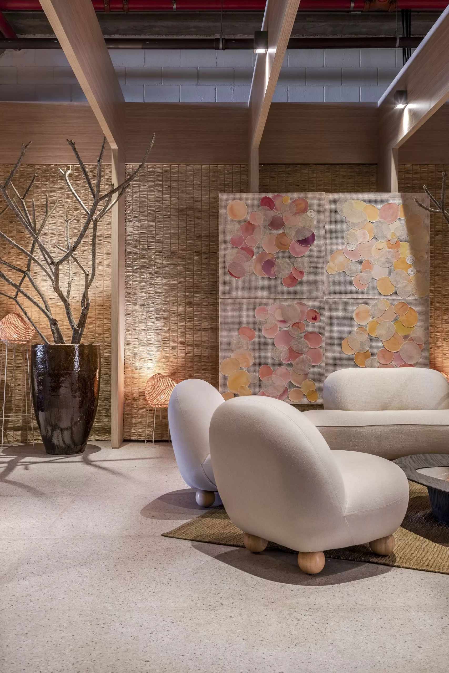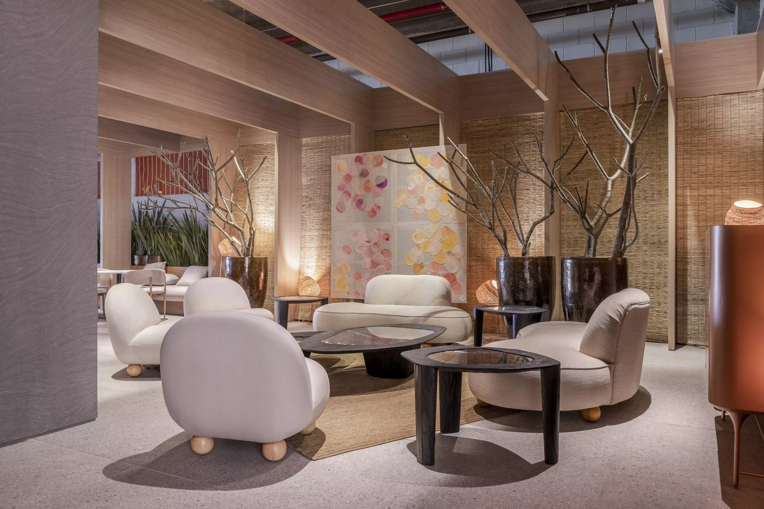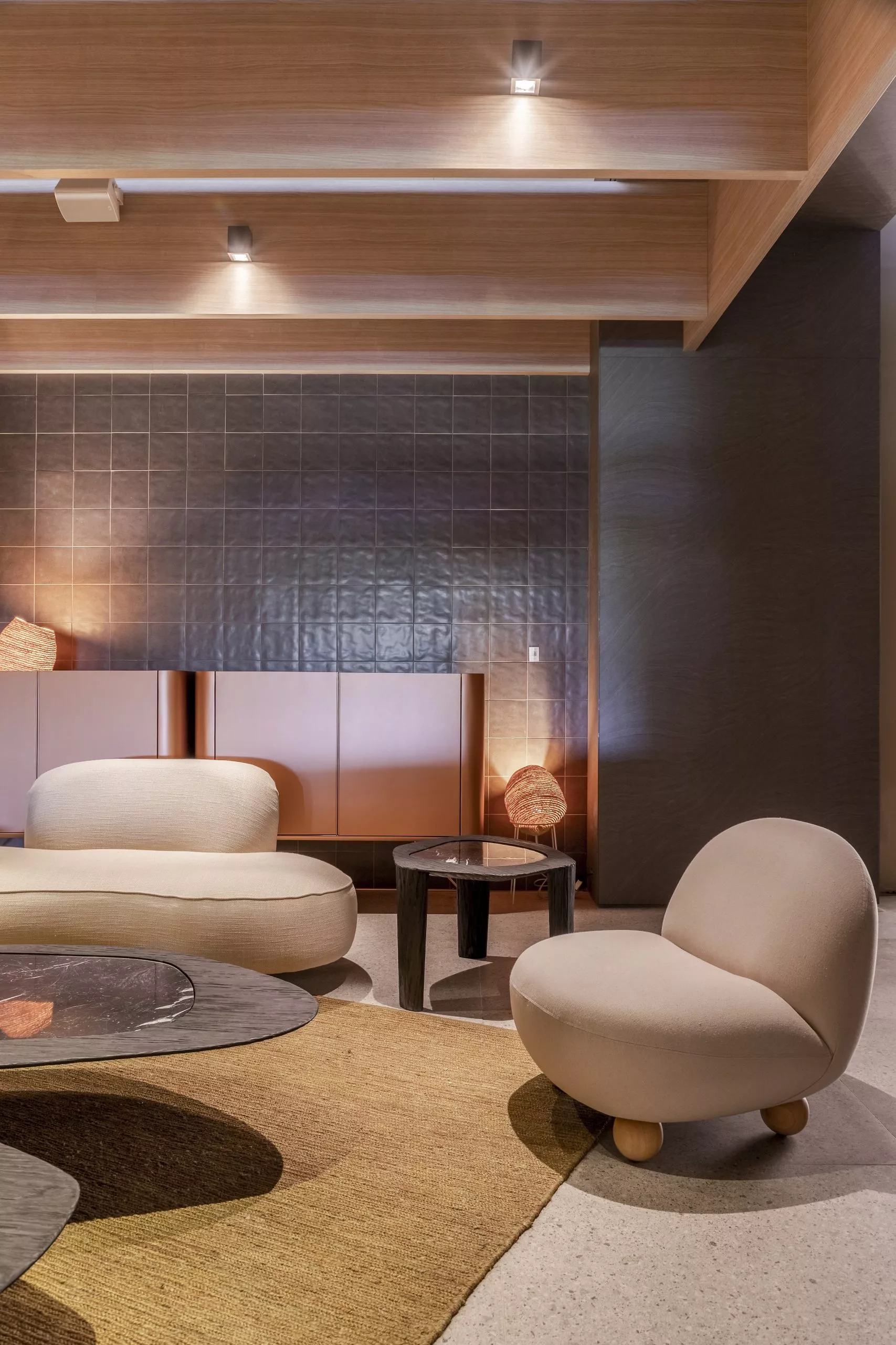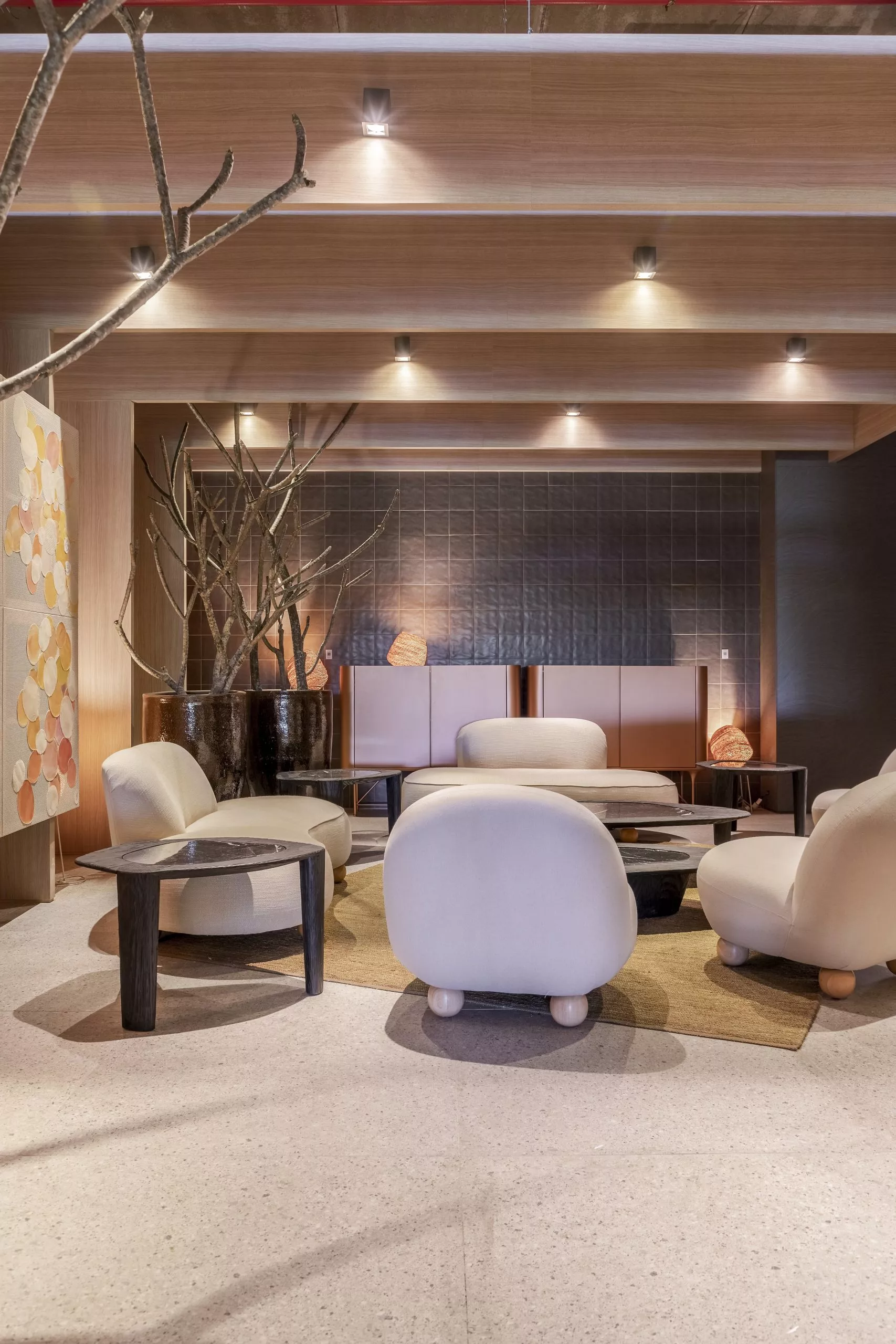 Alinhada com a necessidade de um amplo ambiente arejado e ventilado, o arquiteto Tufi Mousse criou o projeto do Restaurante Terraço, de 366m², traz arquitetura leve e conectada à paisagem externa. Pórticos e pergolados estruturados em metal e revestidos com os padrões Carvalho Batur e Basalto, respectivamente, das linhas Essencial Wood e Conceito, geram uma geometria que define o espaço e demarca em contornos todo o projeto.