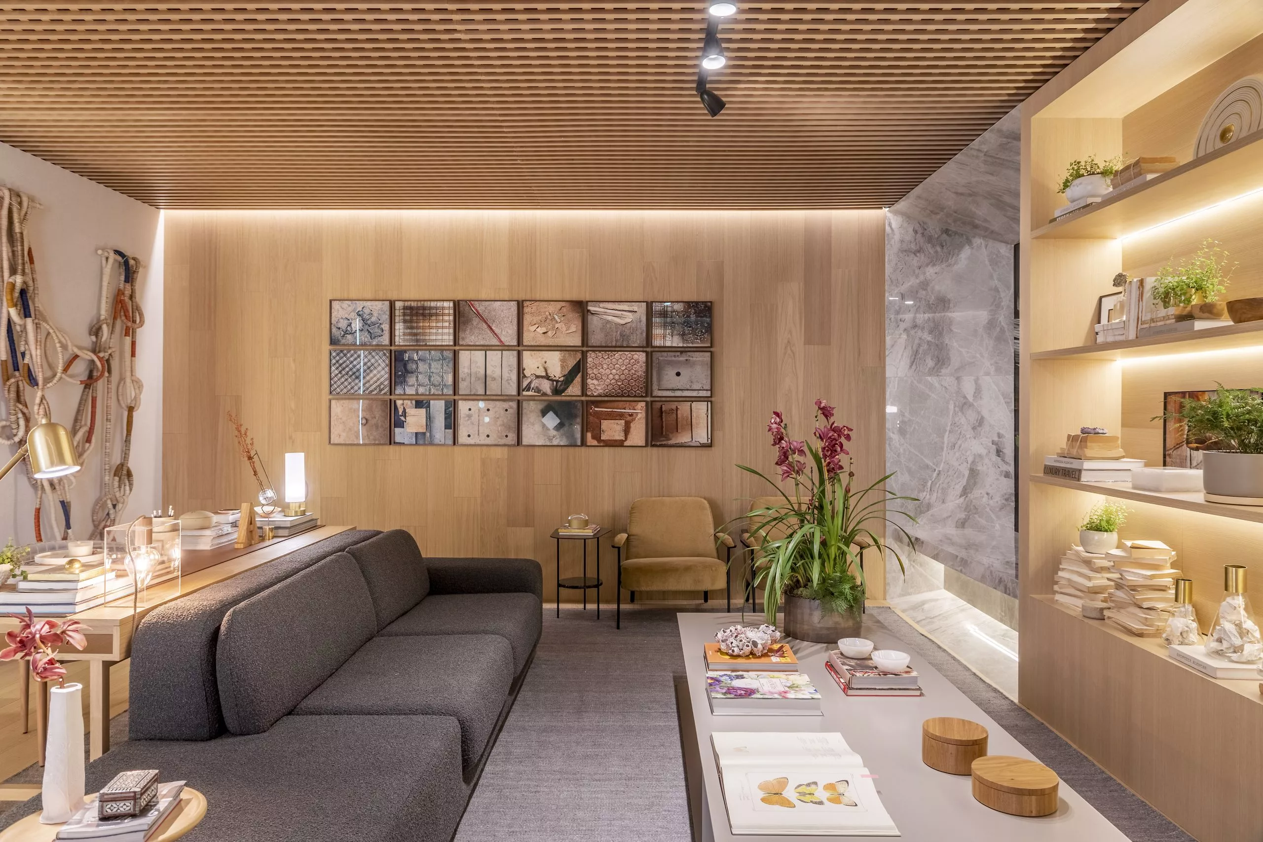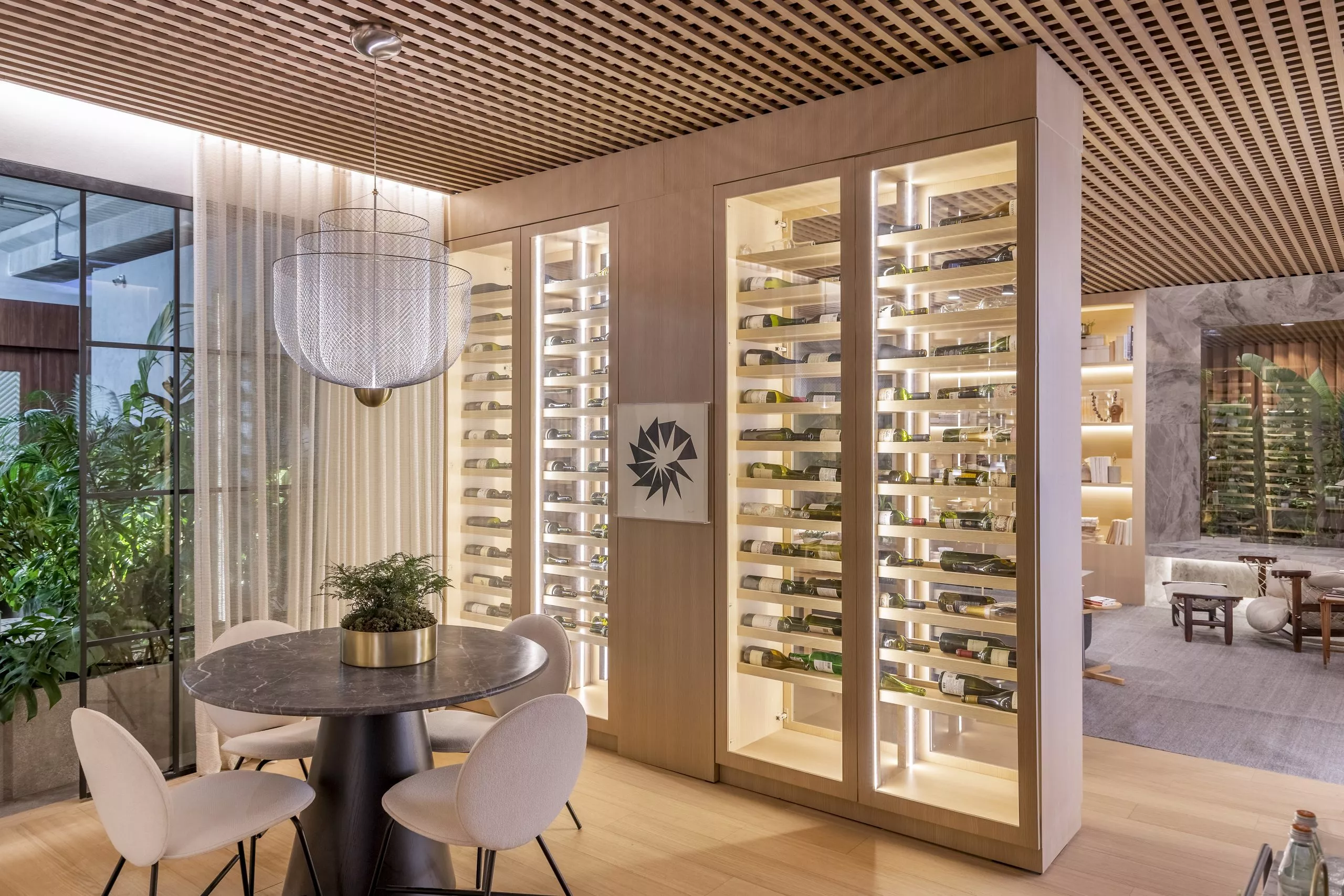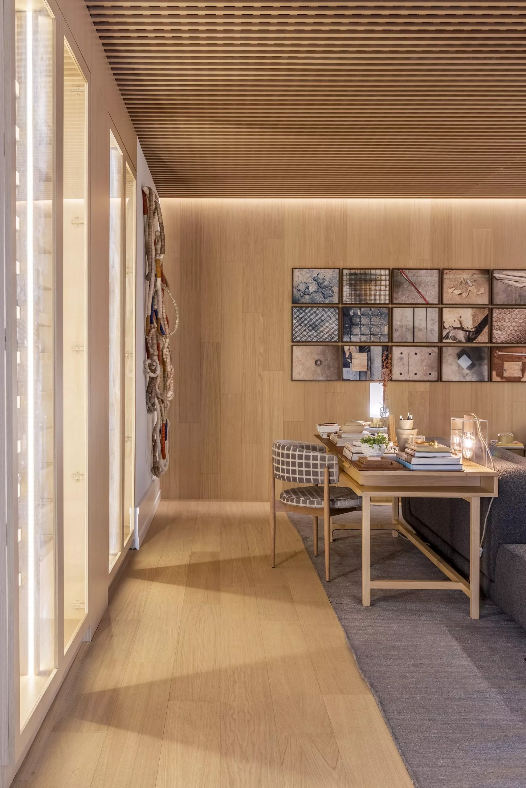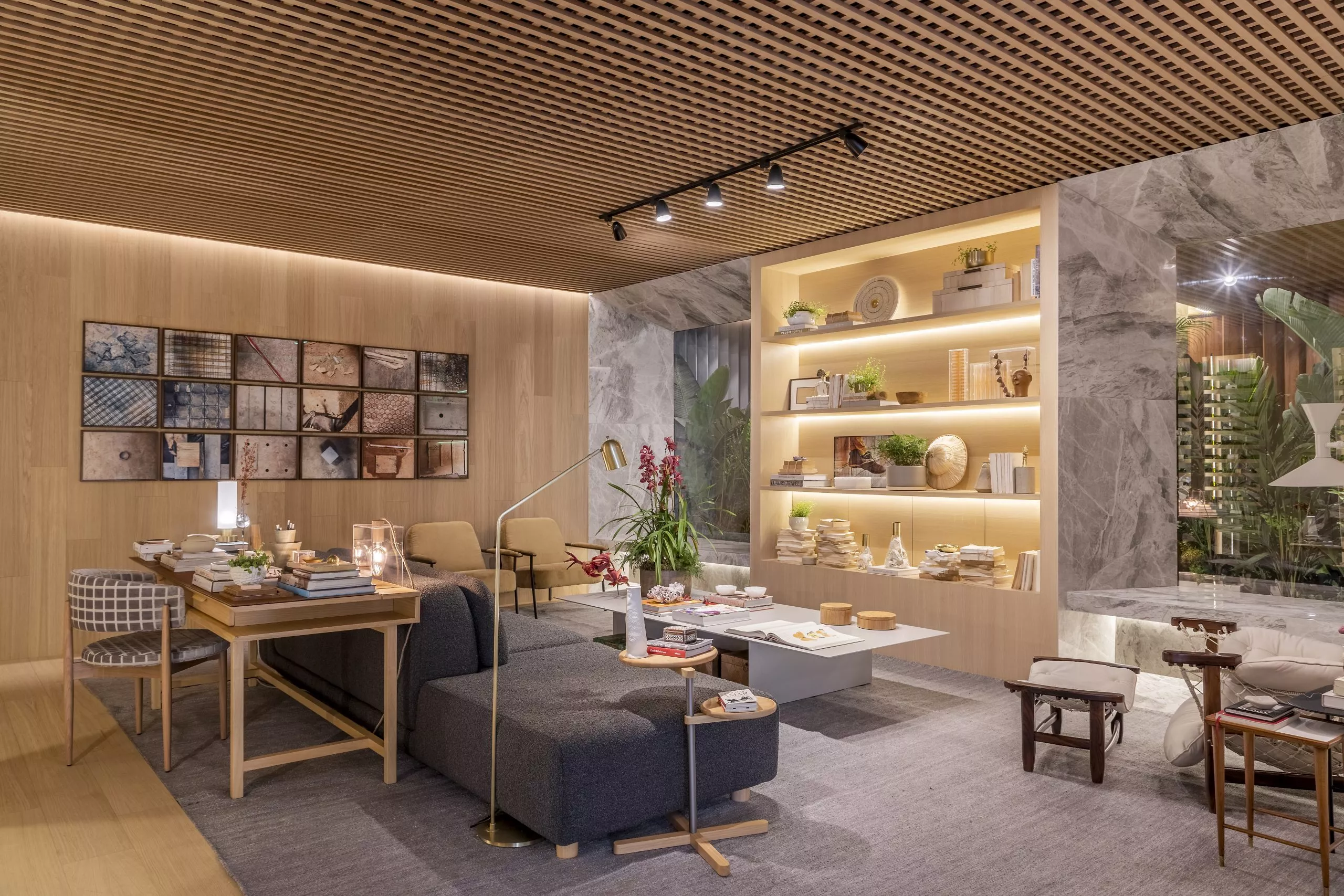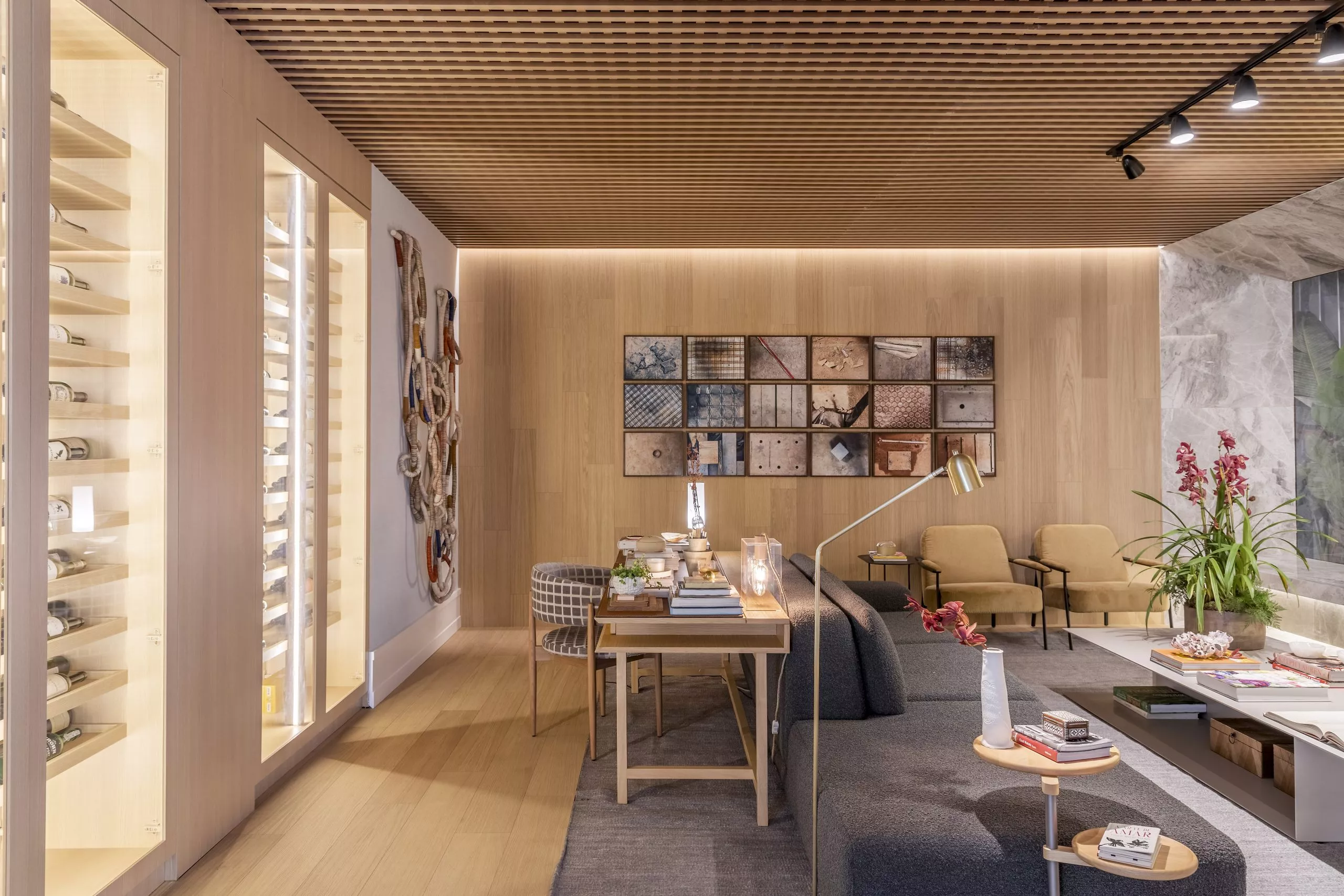 Em sua primeira participação na mostra, Andrezza Alencar propõe, no Studio Raiz, um convite ao retorno às nossas origens numa celebração à memória, ao afeto, e principalmente ao lugar de onde viemos. Nessa proposta, que traz todo o revestimento de teto e paredes com o padrão Carvalho Malva, da linha Design, a profissional elegeu móveis que enaltecem o design brasileiro para compor os ambientes, divididos em living com home office integrado, adega e jantar.