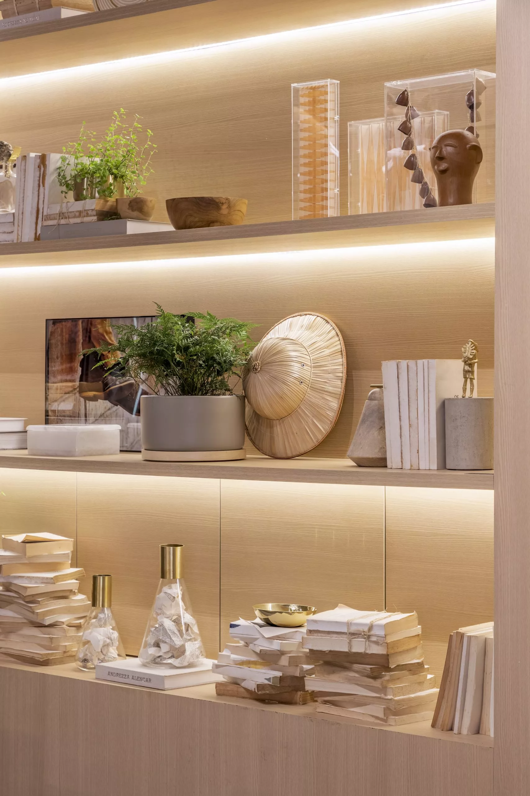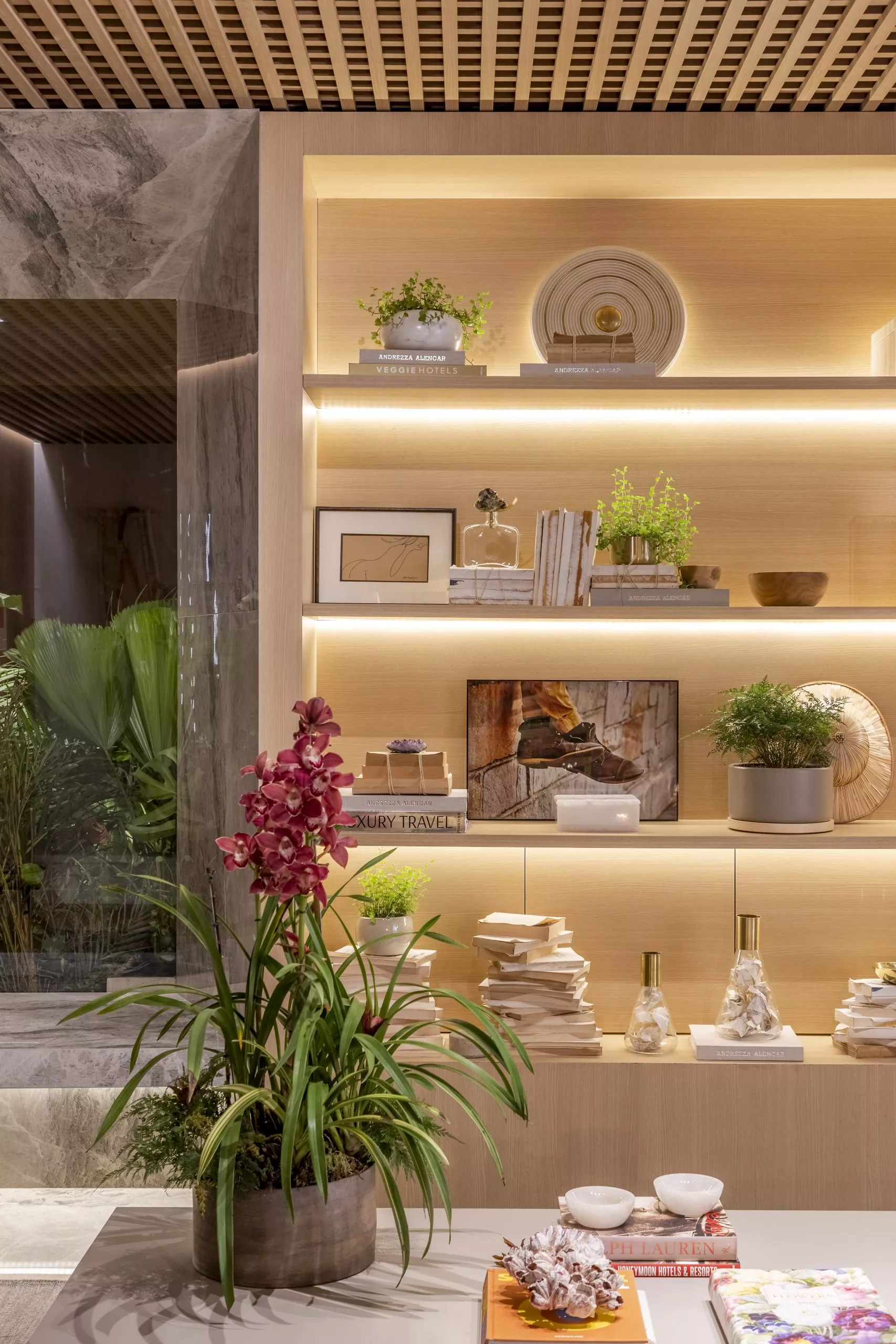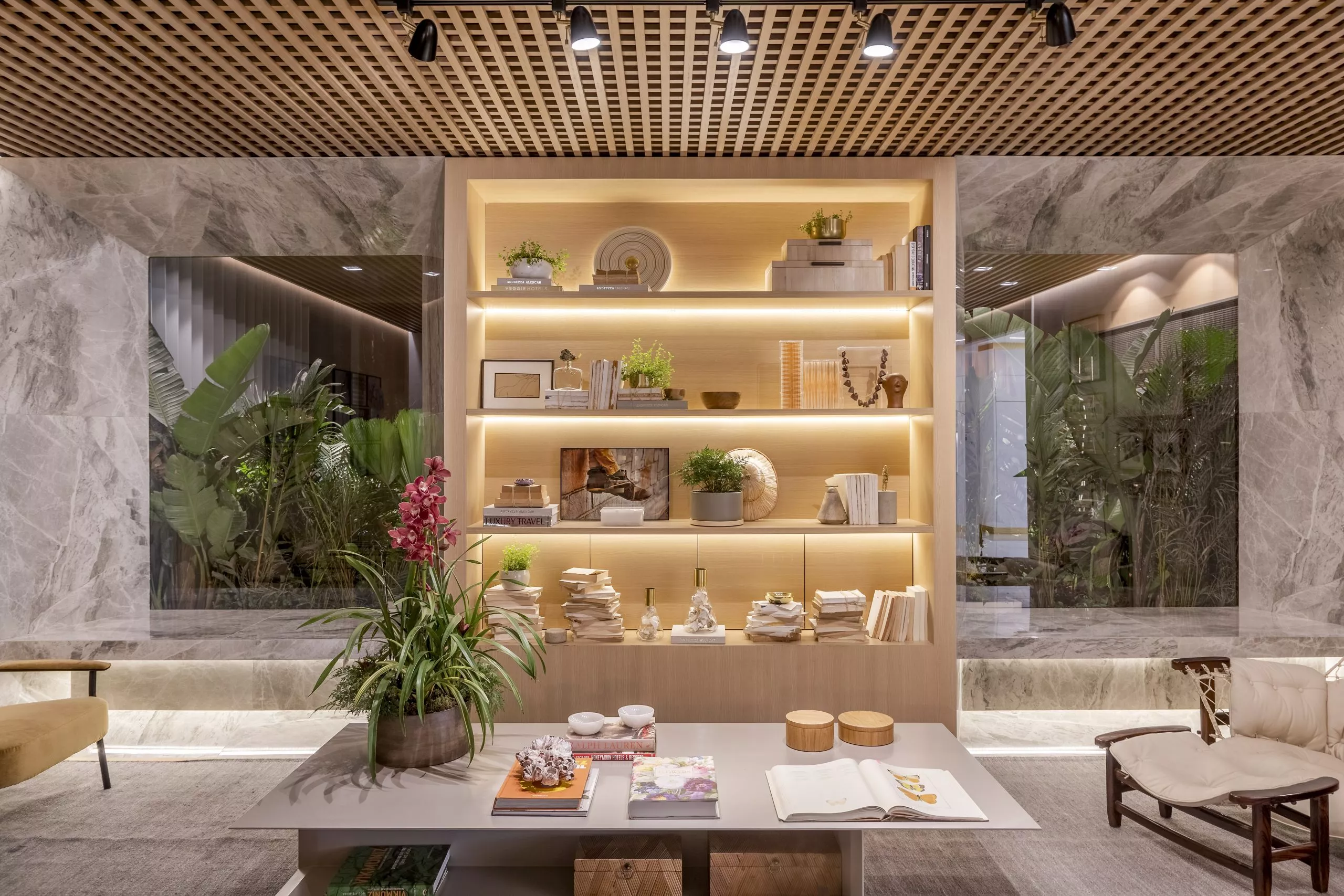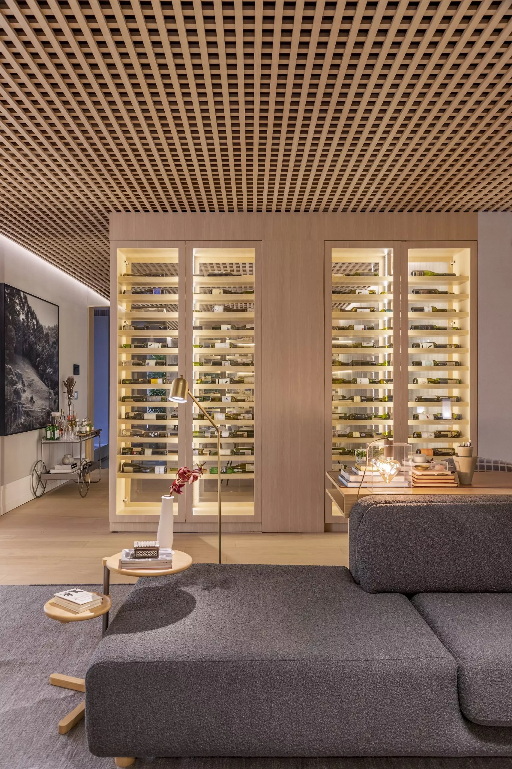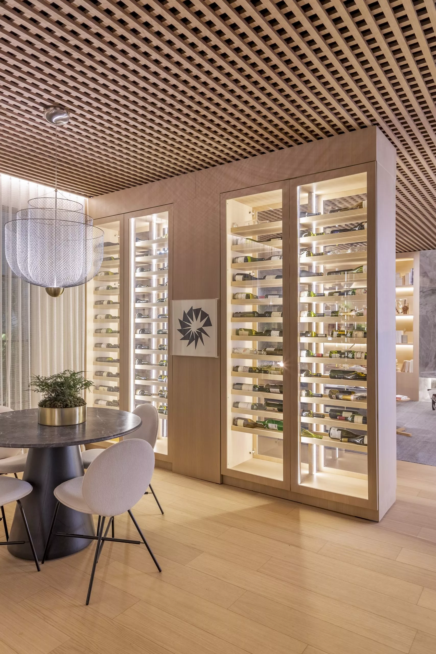Em sua primeira participação na mostra, Andrezza Alencar propõe, no Studio Raiz, um convite ao retorno às nossas origens numa celebração à memória, ao afeto, e principalmente ao lugar de onde viemos. Nessa proposta, que traz todo o revestimento de teto e paredes com o padrão Carvalho Malva, da linha Design, a profissional elegeu móveis que enaltecem o design brasileiro para compor os ambientes, divididos em living com home office integrado, adega e jantar.