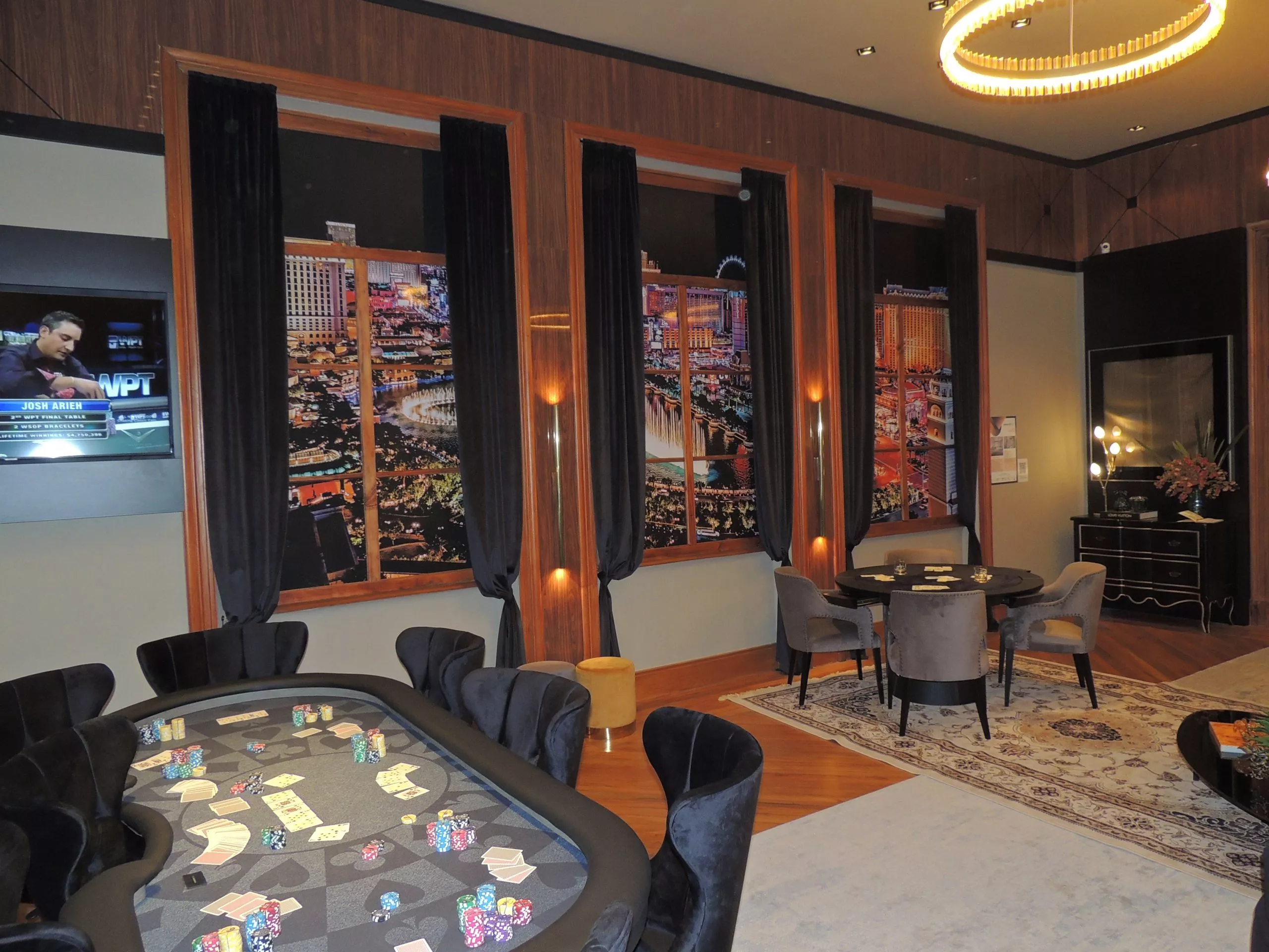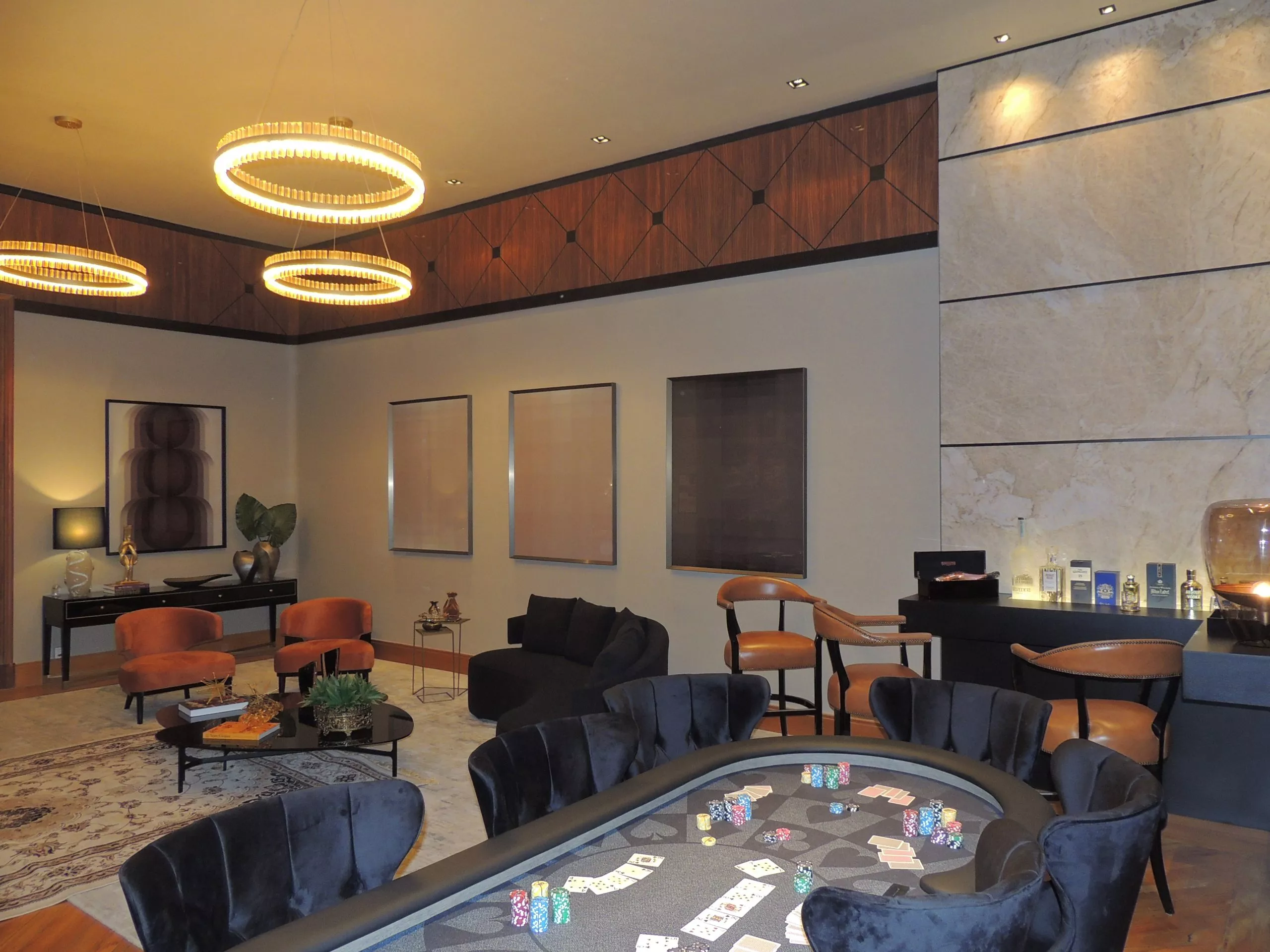 Baseado no Milionary Life Style, Eliane Cardoso especificou os padrões Pau-Ferro Natural e Preto da linha de alto brilho Cristallo para revestir as paredes e produzir o mobiliário do ambiente “Welcome to Las Vegas”, numa alusão ao glamour dos revestimentos dos carros luxuosos e dos iates.
