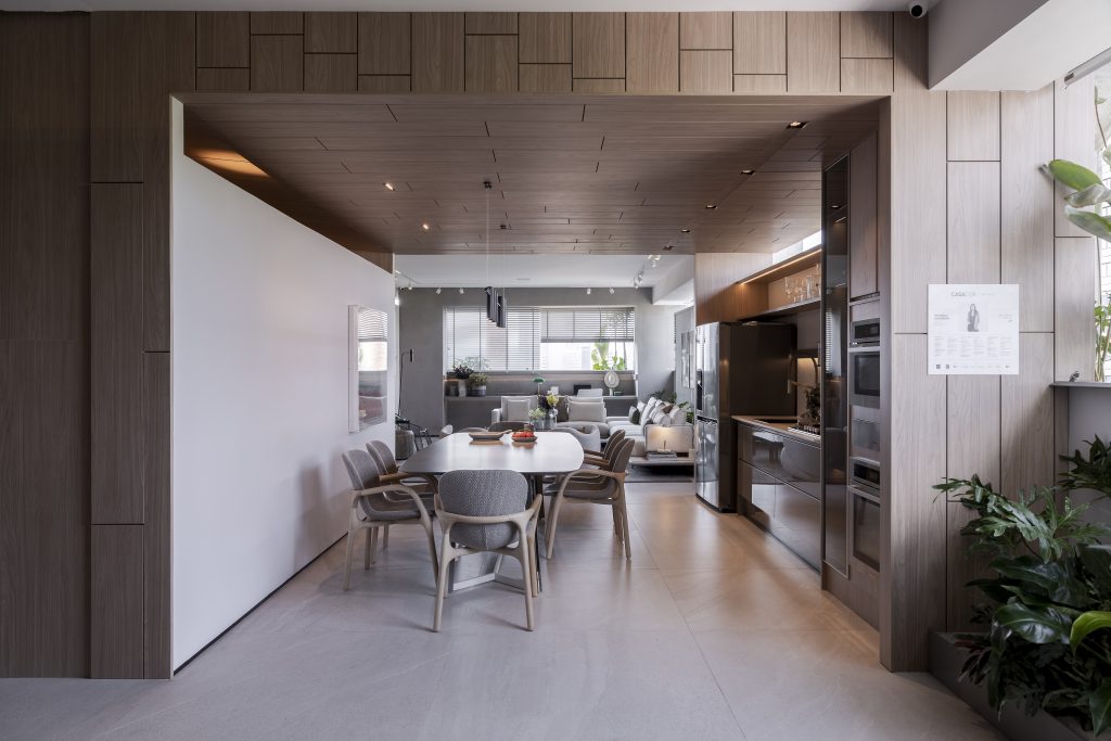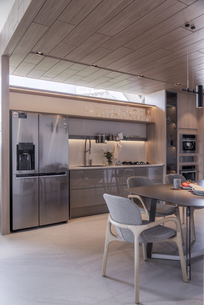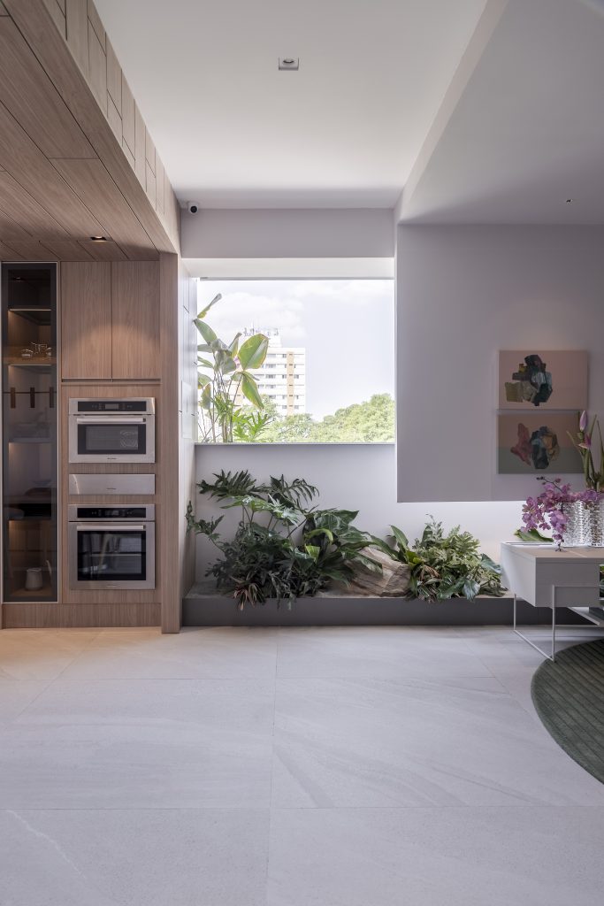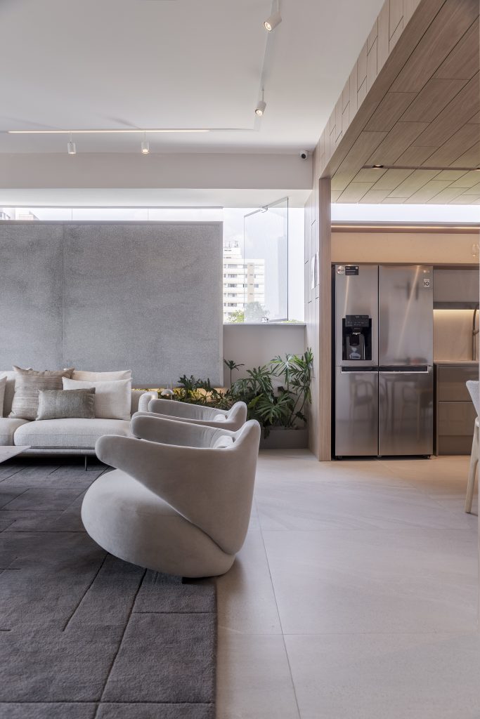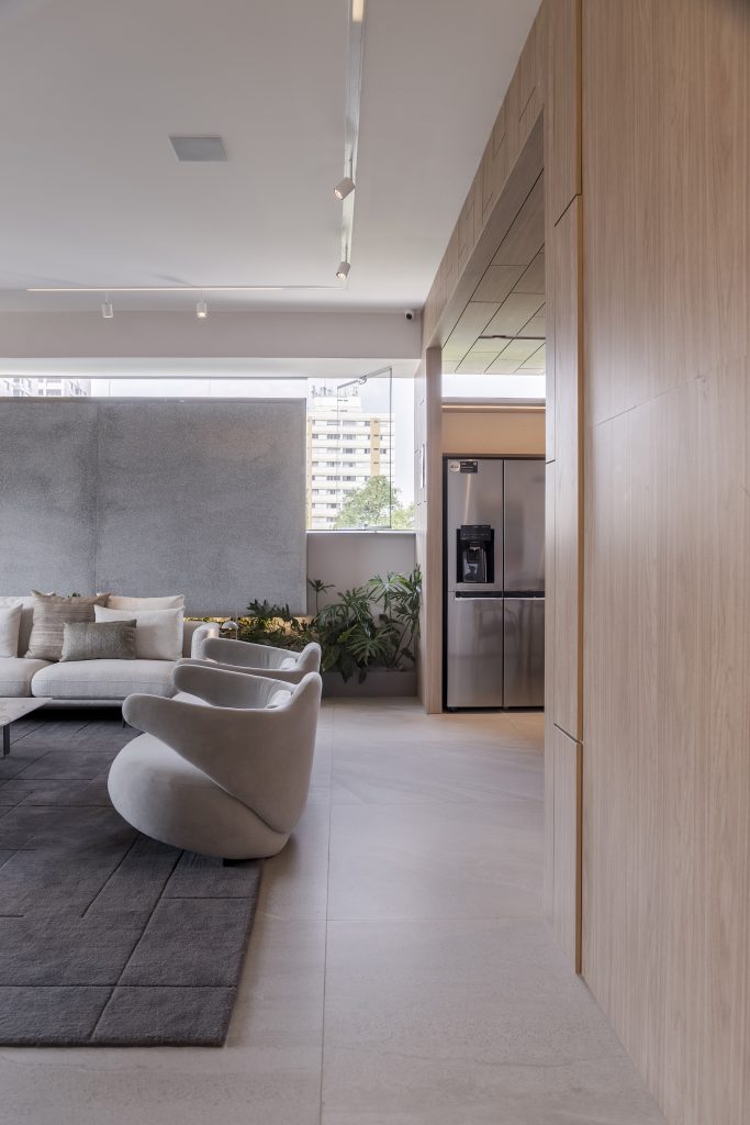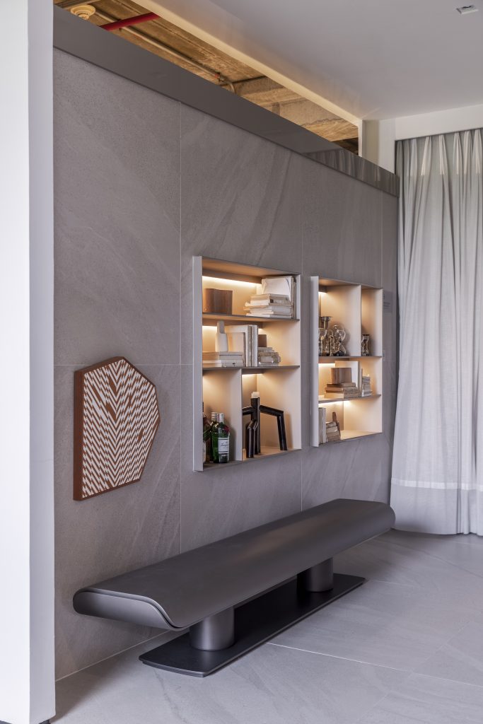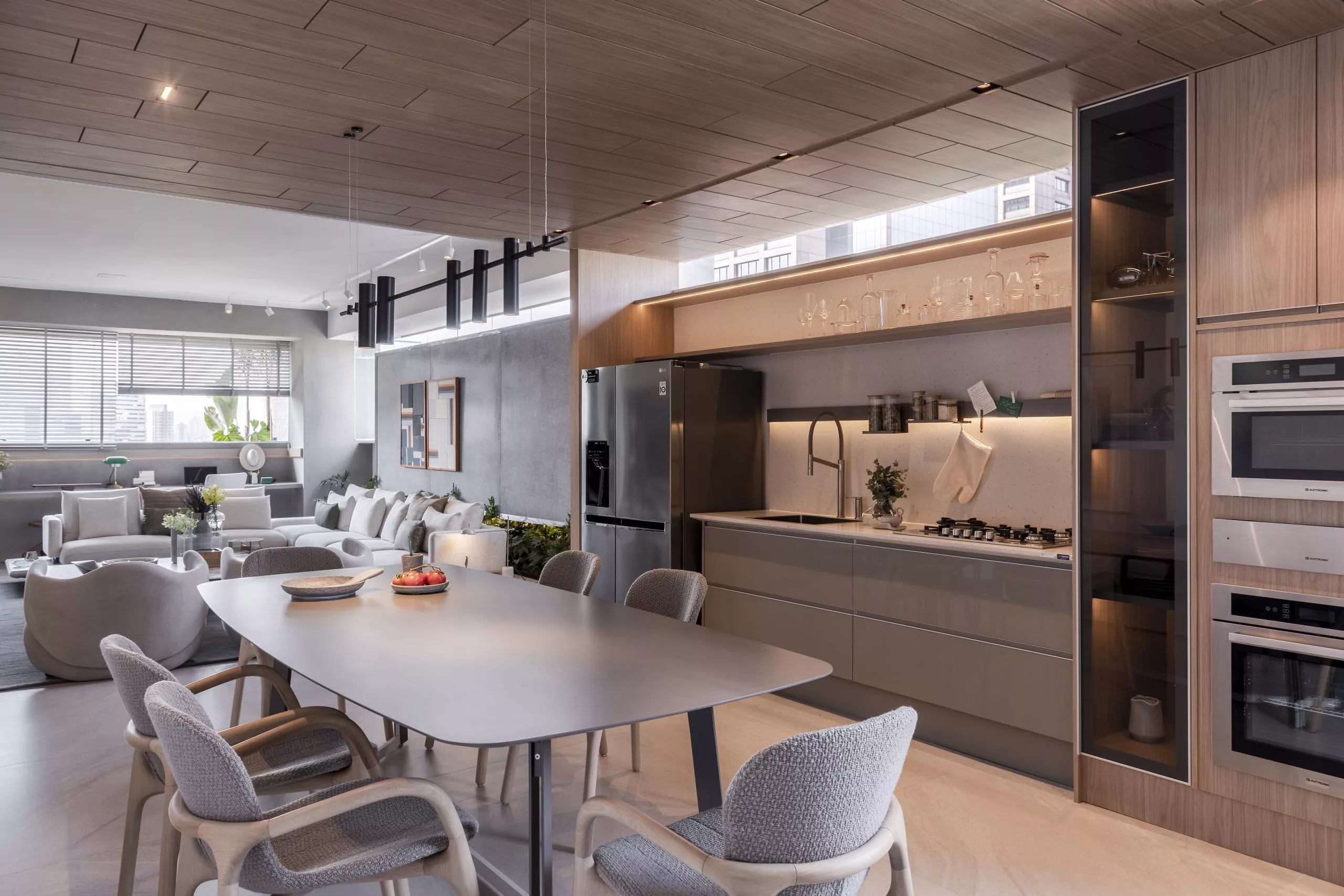 Foi na mitologia grega que Patrícia Hagobian encontrou inspiração para seu projeto. Zéfiro, o deus do vento oeste, de acordo com a lenda, era violento e impetuoso. Para conquistar o coração de sua amada Clóris, deusa da primavera, precisou controlar a sua força, transformando-se em brisa suave. Distribuídos em 140m², os ambientes foram separados em blocos e trazem na marcenaria da cozinha e do hall de entrada uma composição do padrão Duratex Gianduia, nas linhas Trama e Cristallo. Já no revestimento do teto e paredes, Patrícia usou o padrão Nogueira Thar, da linha Design.