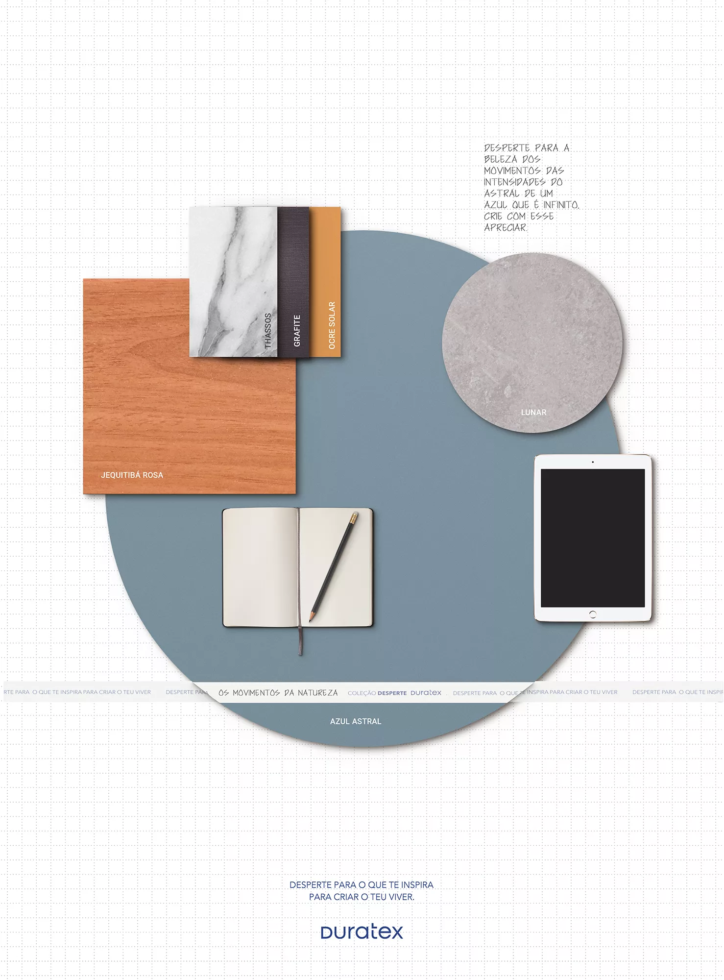 Remete boas energias, consoante aos anseios impostos por momentos desafiadores, seu tom azul emana tranquilidade, nos encoraja à vida. Um convite ao se deixar envolver, imergir, tocar no leve e infinito azul.