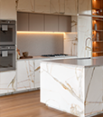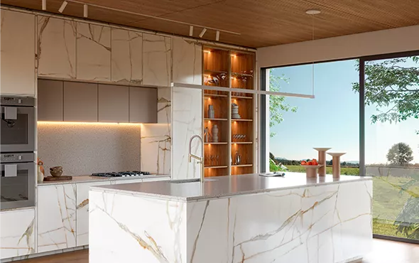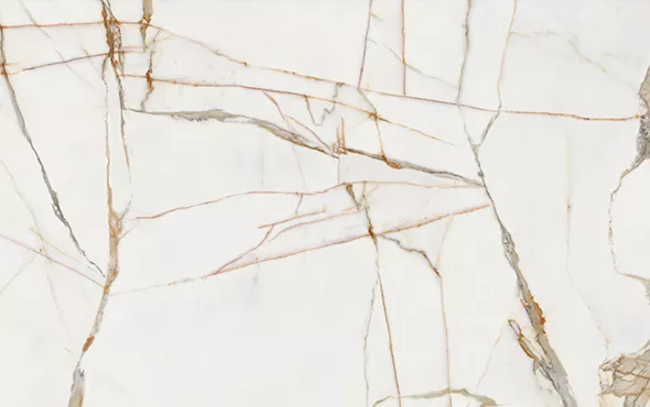A beleza clássica do Calacata em um padrão único com veios dourados, trazendo um toque apurado para os ambientes.
